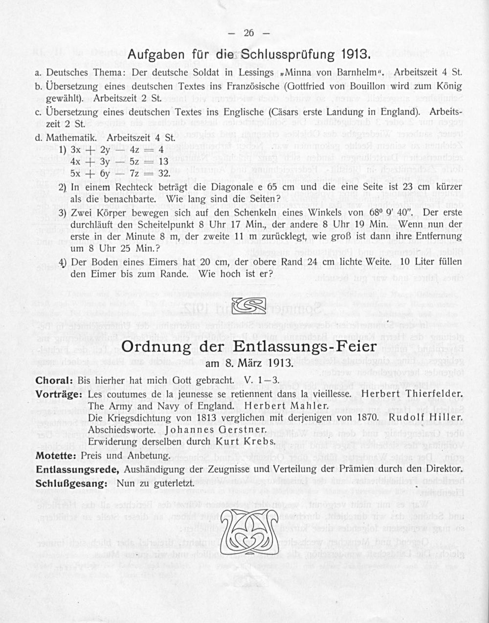 Aufgaben für die Schlussprüfung 1913.