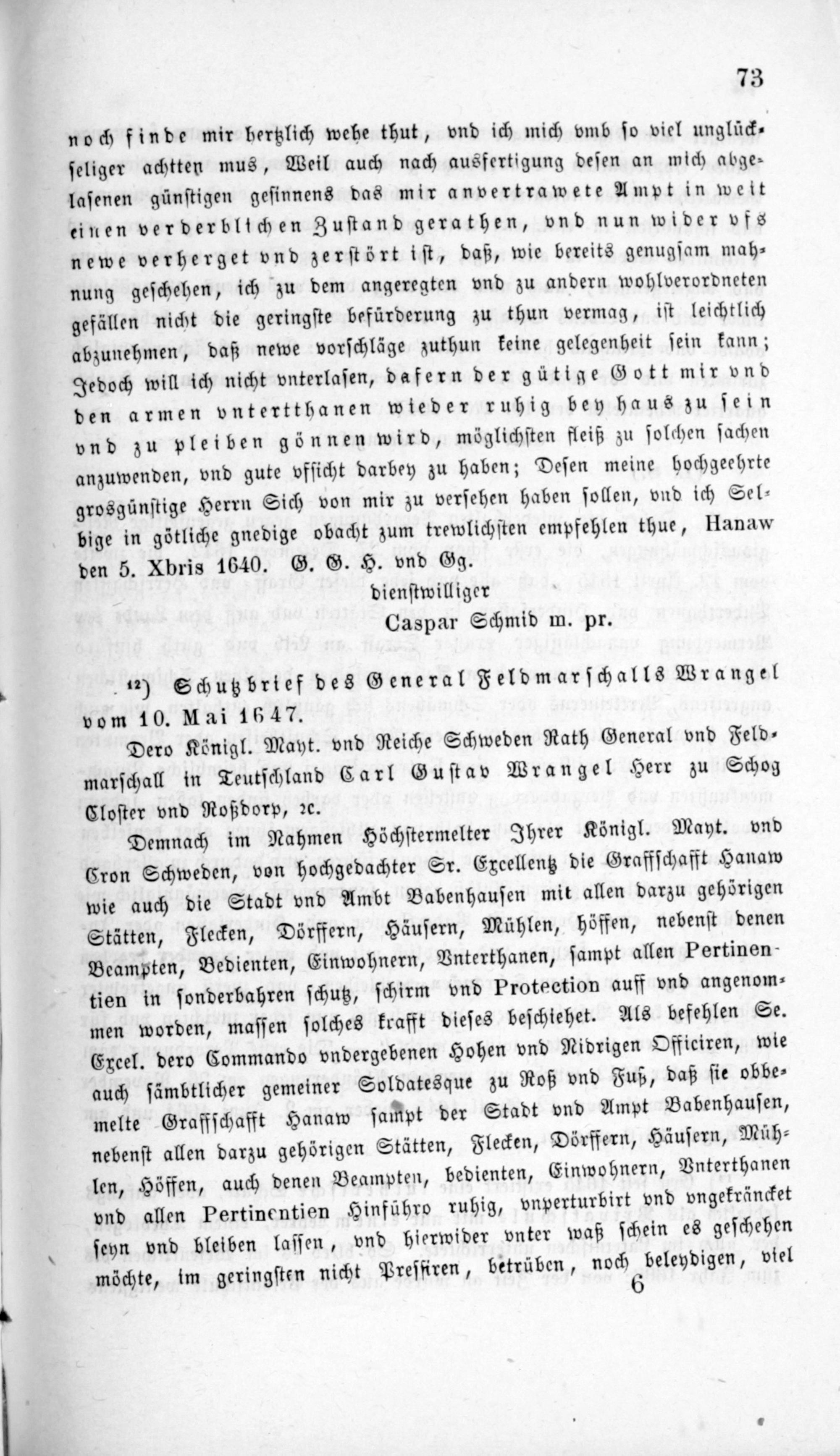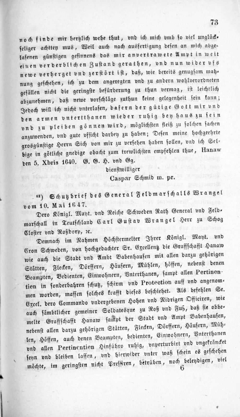 Demnach im Nahmen Höchſtermelter Ihrer Königl. Mayt. vnd Cron Schweden, von hochgedachter Sr. Excellentz die Graffſchafft Hanaw wie auch die Stadt vnd Ambt Babenhauſen mit allen darzu gehörigen Stätten, Flecken, Dörffern, Häuſern, Mühlen, höffen, nebenſt denen Beampten, Bedienten, Einwohnern, Vnterthanen, ſampt allen Pertinen- tien in ſonderbahren ſchutz, ſchirm vnd Protection auff vnd angenom⸗ men worden, maſſen ſolches krafft dieſes beſchiehet. Als befehlen Se. Excel. dero Commando vndergebenen Hohen vnd Nidrigen Officiren, wie auch ſämbtlicher gemeiner Soldatesque zu Roß vnd Fuß, daß ſie obbe⸗ melte Graffſchafft Hanaw ſampt der Stadt vnd Ampt Babenhauſen, nebenſt allen darzu gehörigen Stätten, Flecken, Dörffern, Häuſern, Müh⸗ len, Höffen, auch denen Beampten, bedienten, Einwohnern, Vnterthanen vond allen Pertinentien Hinführo ruhig, vnperturbirt vnd vngekräncket ſeyn vnd bleiben laſſen, vnd hierwider vnter waß ſchein es geſchehen möchte, im geringſten nicht Preſſiren, betrüben, noch beledicen, viel