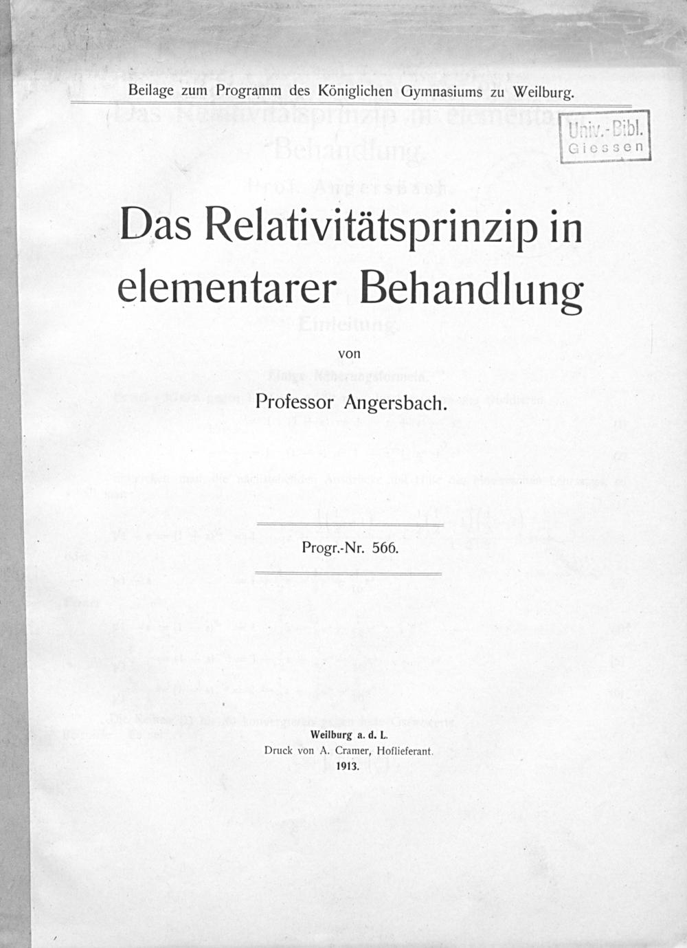 Weilburg a. d. L. Druck von A. Cramer, Hoflieferant. 1913.