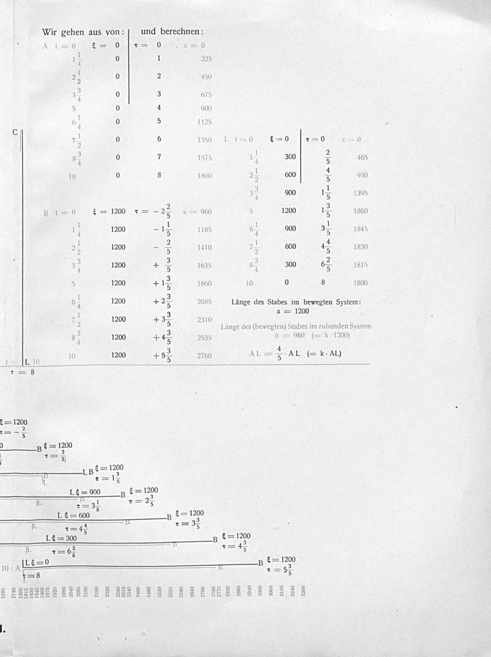 Wir gehen aus von: und berechnen: A t= O0 E= 0 1— 0 X— 0 1, 14 0 1 225 1. 22 0 2 450 33 0 3 34 675 5 0 4 900 6 0 5 1125 74 0 6 1350 I. t= 0 6= 0 1=0*= 0 1 2 8 3 0 7 1575 14 300 4 465 10 0 8 1800 2 1 600 4 930 2 1 37 200 12 1395 . 2 3 B t= 0= 1200 ¼=— 25 x 960 5 1200 15 1860 11 1200— 11. 18⸗ 61 000 31 345 4 5 1185 24 5 1845 .1 2„1 4 3 2 2 1200 3 1410 72 600 45 1830 2 3 2 37 1200 3 4 1635 84 300 65 1815 5 1200+ 13 1860 10 0 8 1800 1 3 6 1200 25 25 2085 Länge des Stabes im bewegten System: 3 a= 1200 75 1200 8 35 2310 4 Länge des(bewegten) Stabes im ruhenden System 83 1200 4⁴ãG 2535 u= 060(= k. 1200) 4 10 1200 4⁵³ 2760 AL= S AL(= k. Al) 36= 1200 1= 5 . LBE= 1200 1 15 1 —= 1200 1†— 35 5 5 L 6= 600 B 8= 1200 B„= 3³ LE= 300 8= 1200 — B 3 2 3*= 47 5 5 1LE=0 B 8= 1200 — 5*— 57 5 5 8E SSSSS 88S8S3 8 8 3. 3 53
