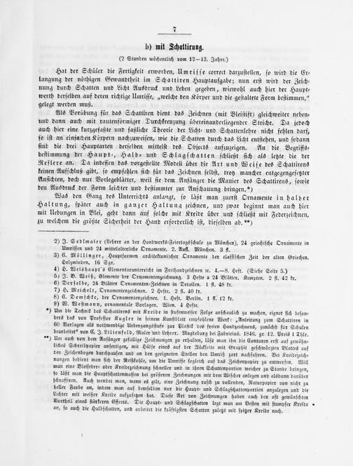 Als Vorübung für das Schattiren dient das Zeichnen(mit Bleiſtift) gleichweiter neben⸗ und dann auch mit rautenförmiger Durchkreuzung übereinanderliegender Striche. Da jedoch auch hier eine kurzgefaßte und faßliche Theorie der Licht⸗ und Schattenlehre nicht fehlen darf, ſo iſt an einfachen Körpern nachzuweiſen, wie die Schatten durch das Licht entſtehen, und ſodann ſind die drei Hauptarten derſelben mittelſt des Objects aufzuzeigen. An die Begriffs⸗ beſtimmung der Haupt-, Halb⸗ und Schlagſchatten ſchließt ſich als letzte die der Reflere an. Da indeſſen das vorgeſtellte Modell über die Art und Weiſe des Schattirens keinen Aufſchluß gibt, ſo empfehlen ſich für das Zeichnen ſelbſt, trotz mancher entgegengeſetzter Anſichten, doch nur Vorlegeblätter, weil ſie dem Anfänger die Manier des Schattirens, ſowie den Ausdruck der Form leichter und beſtimmter zur Anſchauung bringen.*)