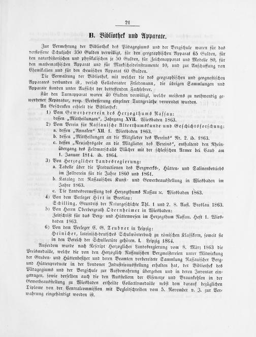 1) Vom Gewerbeverein des Herzogthums Naſſau: deſſen„Mittheilungen“, Jahrgang XVII. Wiesbaden 1863. 2) Vom Verein für Naſſauiſche Alterthumskunde und Geſchichtsforſchung: a. deſſen„Annalen“ XII. 1. Wiesbaden 1863. b. deſſen„Mittheilungen an die Mitglieder des Vereins“ Nr. 2. ib. 1863. c. deſſen„Neujahrsgabe an die Mitglieder des Vereins“, enthaltend den Rhein— übergang des Feldmarſchalls Blücher mit der ſchleſiſchen Armee bei Caub am 1. Januar 1814. ib. 1864. 3) Von Herzoglicher Landesregierung: a. Tabelle über die Productionen des Bergwerks⸗, Hütten⸗ und Salinenbetriebs im Zollverein für die Jahre 1860 und 1861. b. Katalog der Naſſauiſchen Kunſt- und Gewerbeausſtellung in Wiesbaden im Jahre 1863. c. Die Landesvermeſſung des Herzogthums Naſſau ꝛc. Wiesbaden 1863. 4) Von dem Verleger Hirt in Breslau: Schilling, Grundriß der Naturgeſchichte Thl. 1 und 2. 8. Aufl. Breslau 1863. 5) Von Herrn Oberbergrath Odernheimer in Wiesbaden: Zeitſchrift für das Berg- und Hüttenweſen im Herzogthum Naſſau. Heft 1. Wies⸗ baden 1863. 6) Von dem Verleger C. G. Teubner in Leipzig: Heinicher, lateiniſch-deutſches Schulwörterbuch zu römiſchen Klaſſikern, ſoweit ſie in den Bereich der Schullectüre gehören. I. Leipzig 1864.