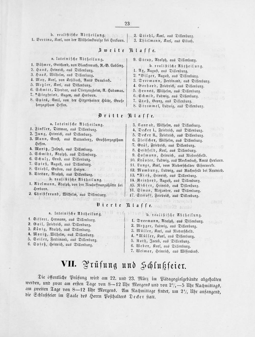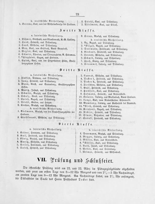 3 1. Finkler, Dittmar, aus Dillenburg. 4 2. Jung, Heinrich, aus Dillenburg. 5 3. Mann, Ernſt, aus Battenberg, Großherzogthum 6 Heſſen. 7. 4. Moritz, Joſeph, aus Dillenburg. 8 5. Schmidt, Adolph, aus Dillenburg. 9 6. Schulz, Ernſt, aus Dillenburg. 10. 7. Spieß, Auguſt, aus Dillenburg. 11. 8. Stiehl, Guſtav, aus Haiger. 12. 9. Vietor, Adolph, aus Dillenburg. 13. b. realiſtiſche Abtheilung. 14. 1. Adelmann, Adolph, von der Neuhoffnungshütte bei 15. Herborn. 16. 2. Chriſtfreund, Wilhelm, aus Dillenburg. 17. Dierte Kl