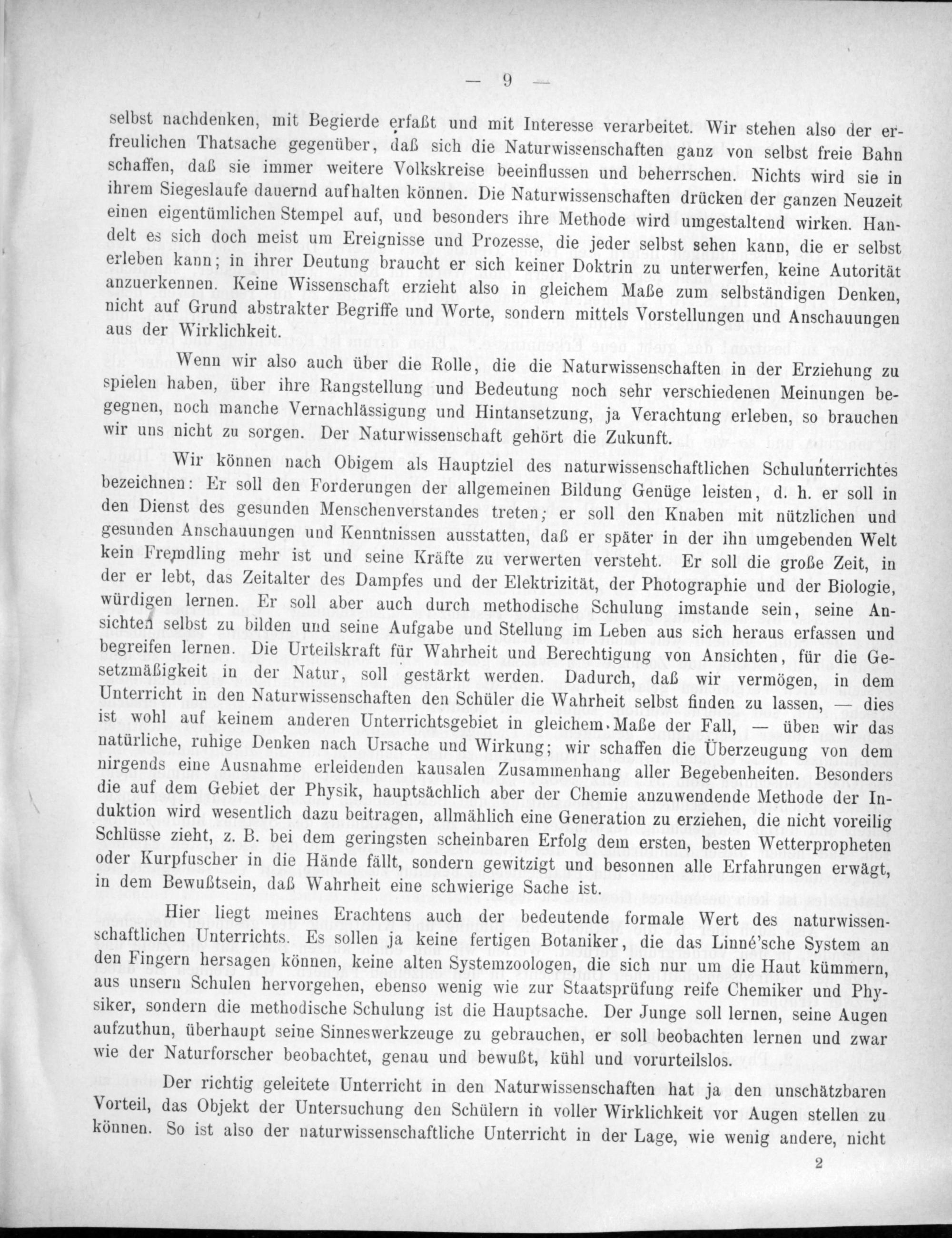 Hier liegt meines Erachtens auch der bedeutende formale Wert des naturwissen- schaftlichen Unterrichts. Es sollen ja keine fertigen Botaniker, die das Linné'sche System an den Fingern hersagen können, keine alten Systemzoologen, die sich nur um die Haut kümmern, aus unsern Schulen hervorgehen, ebenso wenig wie zur Staatsprüfung reife Chemiker und Phy- siker, sondern die methodische Schulung ist die Hauptsache. Der Junge soll lernen, seine Augen aufzuthun, überhaupt seine Sinneswerkzeuge zu gebrauchen, er soll beobachten lernen und zwar wie der Naturforscher beobachtet, genau und bewußt, kühl und vorurteilslos.