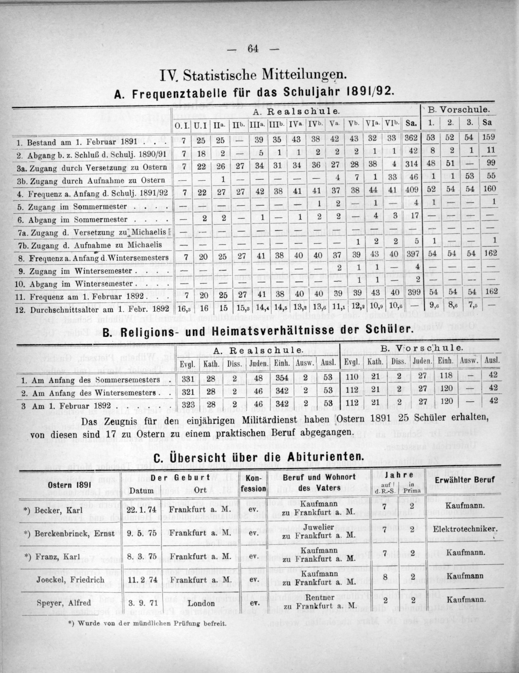 IV Statistische Mitteilungen. 4. frequenztabelle für das Schuljahr 1891/92.