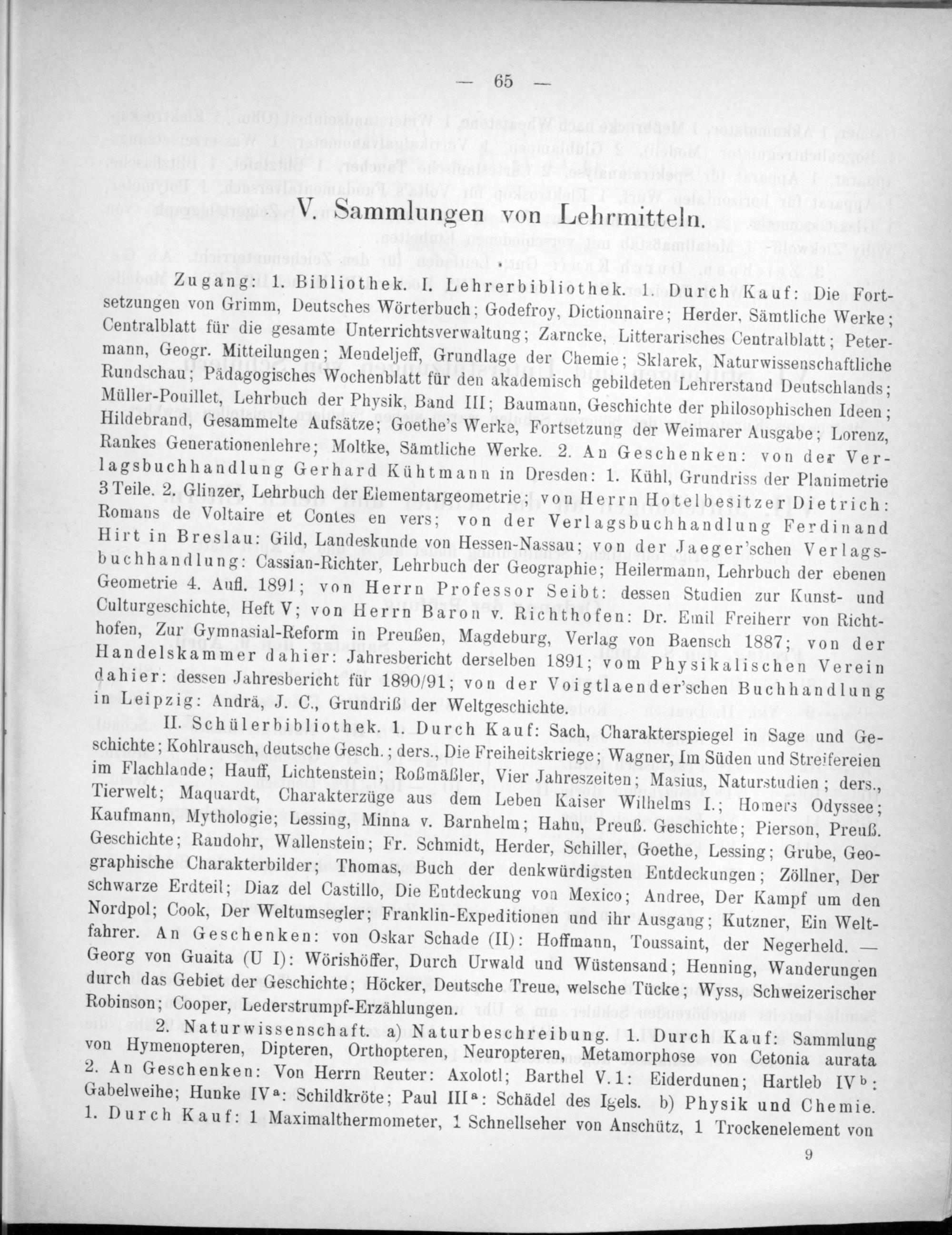 Zugang: 1. Bibliothek. I. Lehrerbibliothek. 1. Durch Kauf: Die Fort- setzungen von Grimm, Deutsches Wörterbuch: Godefroy, Dictionnaire; Herder. Sämtliche Werke; Centralblatt für die gesamte Unterrichtsverwaltung; Zarncke, Litterarisches Centralblatt; Peter- mann, Geogr. Mitteilungen; Mendeljeff, Grundlage der Chemie; Sklarek, Naturwissenschaftliche Rundschau; Pädagogisches Wochenblatt für den akademisch gebildeten Lehrerstand Deutschlands; Müller-Pouillet, Lehrbuch der Physik, Band III; Baumann, Geschichte der philosophischen Ideen; Hildebrand, Gesammelte Aufsätze; Goethe's Werke, Fortsetzung der Weimarer Ausgabe; Lorenz, Rankes Generationenlehre; Moltke, Sämtliche Werke. 2. An Geschenken: von der vVer- lagsbuchhandlung Gerhard Kühtmann in Dresden: 1. Kühl, Grundriss der Planimetrie 3 Teile. 2. Glinzer, Lehrbuch der Elementargeometrie; von Herrn Hotel besitzer Dietrich: Romans de Voltaire et Contes en vers; von der Verlagsbuchhandlung Ferdinand Hirt in Breslau: Gild, Landeskunde von Hessen-Nassau; von der Jaeger'’'schen Verlags- buchhandlung: Cassian-Richter, Lehrbuch der Geographie; Heilermann, Lehrbuch der ebenen Geometrie 4. Aufl. 1891; von Herrn Professor Seibt: dessen Studien zur Kunst- und Culturgeschichte, Heft V; von Herrn Baron v. Richthofen: Dr. Emil Freiherr von Richt- hofen, Zur Gymnasial-Reform in Preußen, Magdeburg, Verlag von Baensch 1887; von der Handelskammer dahier: Jahresbericht derselben 1891; vom Physikalischen verein dahier: dessen Jahresbericht für 1890/91; von der Voigtlaender'schen Buchhandlung in Leipzig: Andraà, J. C., Grundriß der Weltgeschichte.
