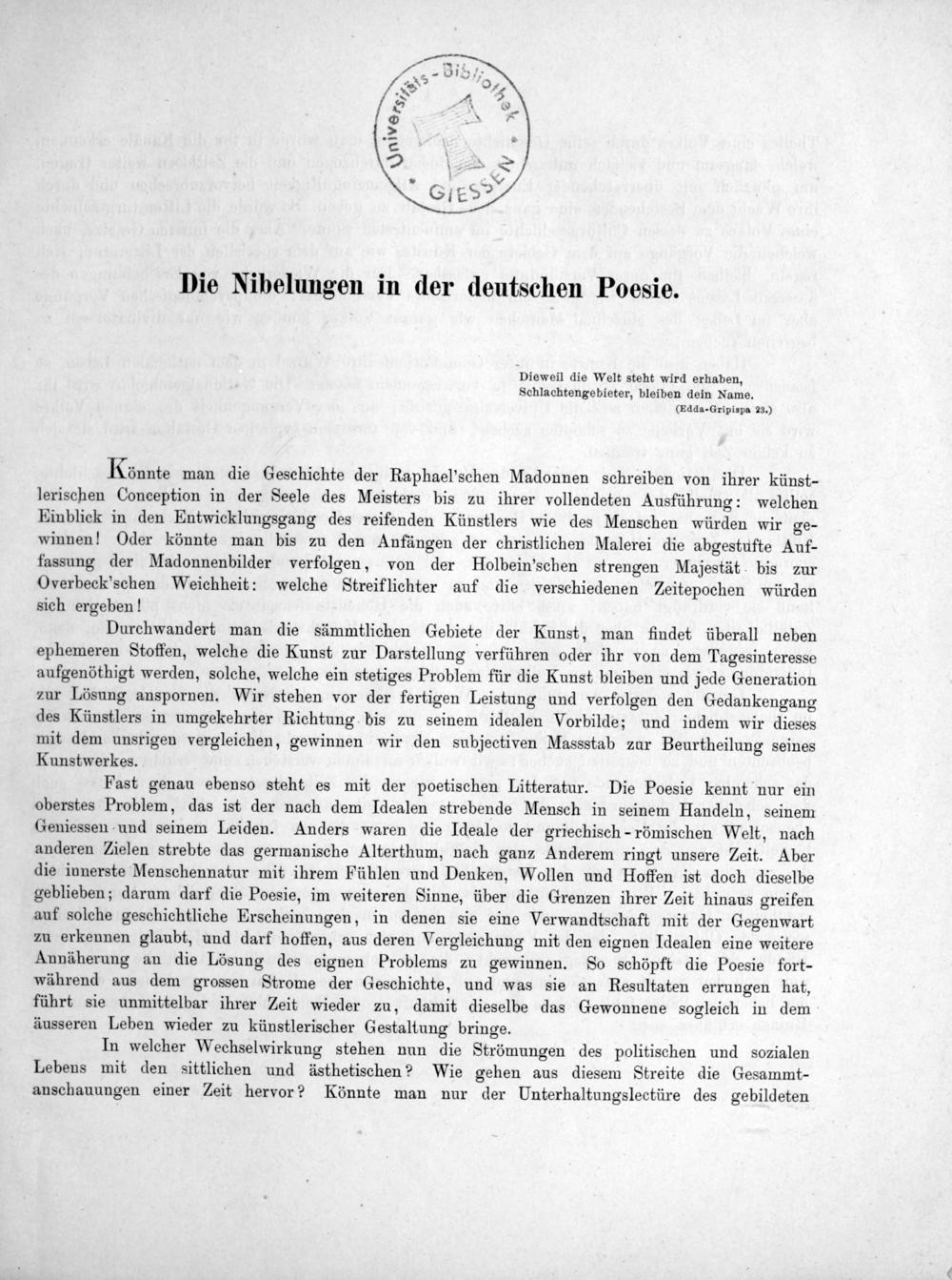 Fast genau ebenso steht es mit der poetischen Litteratur. Die Poesie kennt nur ein oberstes Problem, das ist der nach dem Idealen strebende Mensch in seinem Handeln, seinem Geniessen und seinem Leiden. Anders waren die Ideale der griechisch-römischen Welt, nach anderen Zielen strebte das germanische Alterthum, nach ganz Anderem ringt unsere Zeit. Aber die innerste Menschennatur mit ihrem Fühlen und Denken, Wollen und Hoffen ist doch dieselbe geblieben; darum darf die Poesie, im weiteren Sinne, über die Grenzen ihrer Zeit hinaus greifen auf solche geschichtliche Erscheinungen, in denen sie eine Verwandtschaft mit der Gegenwart zu erkennen glaubt, und darf hoffen, aus deren Vergleichung mit den eignen Idealen eine weitere Annäherung an die Lösung des eignen Problems zu gewinnen. So schöpft die Poesie fort- während aus dem grossen Strome der Geschichte, und was sie an Resultaten errungen hat, führt sie unmittelbar ihrer Zeit wieder zu, damit dieselbe das Gewonnene sogleich in dem äusseren Leben wieder zu künstlerischer Gestaltung bringe.