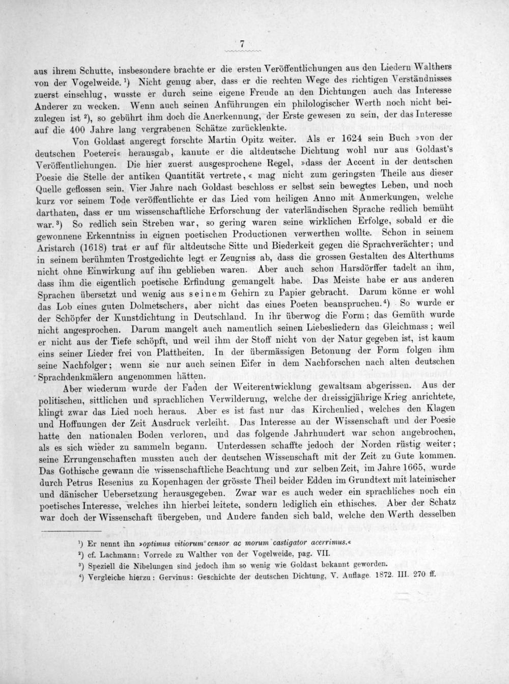 Von Goldast angeregt forschte Martin Opitz weiter. Als er 1624 sein Buch»von der deutschen Poeterei« herausgab, kanute er die altdeutsche Dichtung wohl nur aus Goldast's Veröffentlichungen. Die hier zuerst ausgesprochene Regel,»dass der Accent in der deutschen Poesie die Stelle der antiken Quantität vertrete,« mag nicht zum geringsten Theile aus dieser Quelle geflossen sein. Vier Jahre nach Goldast beschloss er selbst sein bewegtes Leben, und noch kurz vor seinem Tode veröffentlichte er das Lied vom heiligen Anno mit Anmerkungen, welche darthaten, dass er um wissenschaftliche Erforschung der vaterländischen Sprache redlich bemüht war. ³) So redlich sein Streben war, so gering waren seine wirklichen Erfolge, sobald er die gewonnene Erkenntniss in eignen poetischen Productionen verwerthen wollte. Schon in seinem Aristarch(1618) trat er auf für altdeutsche Sitte und Biederkeit gegen die Sprachverächter; und in seinem berühmten Trostgedichte legt er Zeugniss ab, dass die grossen Gestalten des Alterthums nicht ohne Einwirkung auf ihn geblieben waren. Aber auch schon Harsdörffer tadelt an ihm, dass ihm die eigentlich poetische Erfindung gemangelt habe. Das Meiste habe er aus anderen Sprachen übersetzt und wenig aus seinem Gehirn zu Papier gebracht. Darum könne er wohl das Lob eines guten Dolmetschers, aber nicht das eines Poeten beansprucheu. ¹) So wurde er der Schöpfer der Kunstdichtung in Deutschland. In ihr überwog die Form; das Gemüth wurde nicht angesprochen. Darum mangelt auch namentlich seinen Liebesliedern das Gleichmass; weil er nicht aus der Tiefe schöpft, und weil ihm der Stoff nicht von der Natur gegeben ist, ist kaum eins seiner Lieder frei von Plattheiten. In der übermässigen Betonung der Form folgen ihm seine Nachfolger; wenn sie nur auch seinen Eifer in dem Nachforschen nach alten deutschen