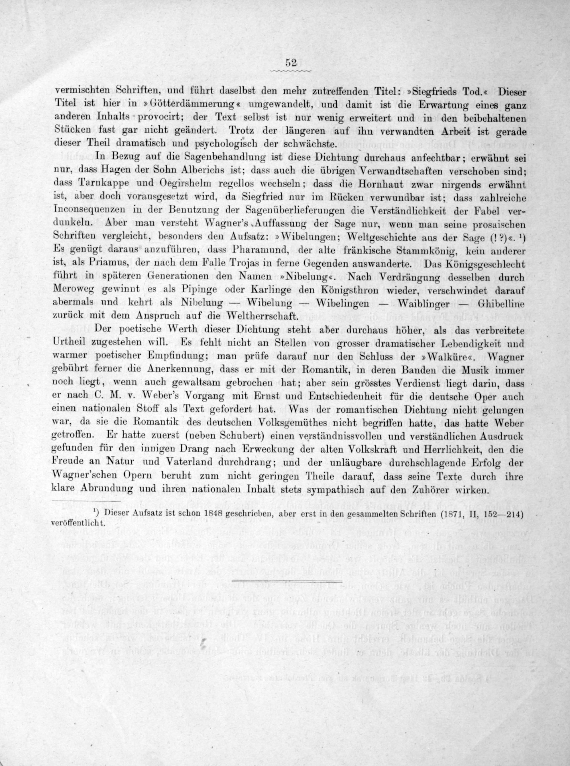 Der poetische Werth dieser Dichtung steht aber qurchaus höher, als das verbreitete Urtheil zugestehen will. Es fehlt nicht an Stellen von grosser dramatischer Lebendigkeit und warmer poetischer Empfindung; man prüfe darauf nur den Schluss der»Walküre«. Wagner gebührt ferner die Anerkennung, dass er mit der Romantik, in deren Banden die Musik immer noch liegt, wenn auch gewaltsam gebrochen hat; aber sein grösstes Verdienst liegt darin, dass er nach C. M. v. Weber'’s Vorgang mit Erust und Entschiedenheit für die deutsche Oper auch einen nationalen Stoff als Text gefordert hat. Was der romantischen Dichtung nicht gelungen war, da sie die Romantik des deutschen Volksgemüthes nicht begriffen hatte, das hatte Weber getroffen. Er hatte zuerst(neben Schubert) einen verständnissvollen und verständlichen Ausdruck gefunden für den innigen Drang nach Erweckung der alten Volkskraft und Herrlichkeit, den die Freude an Natur und Vaterland durchdrang; und der unläugbare durchschlagende Erfolg der Wagner'schen Opern beruht zum nicht geringen Theile darauf, dass seine Texte durch ihre klare Abrundung und ihren nationalen Inhalt stets sympathisch auf den Zuhörer wirken.