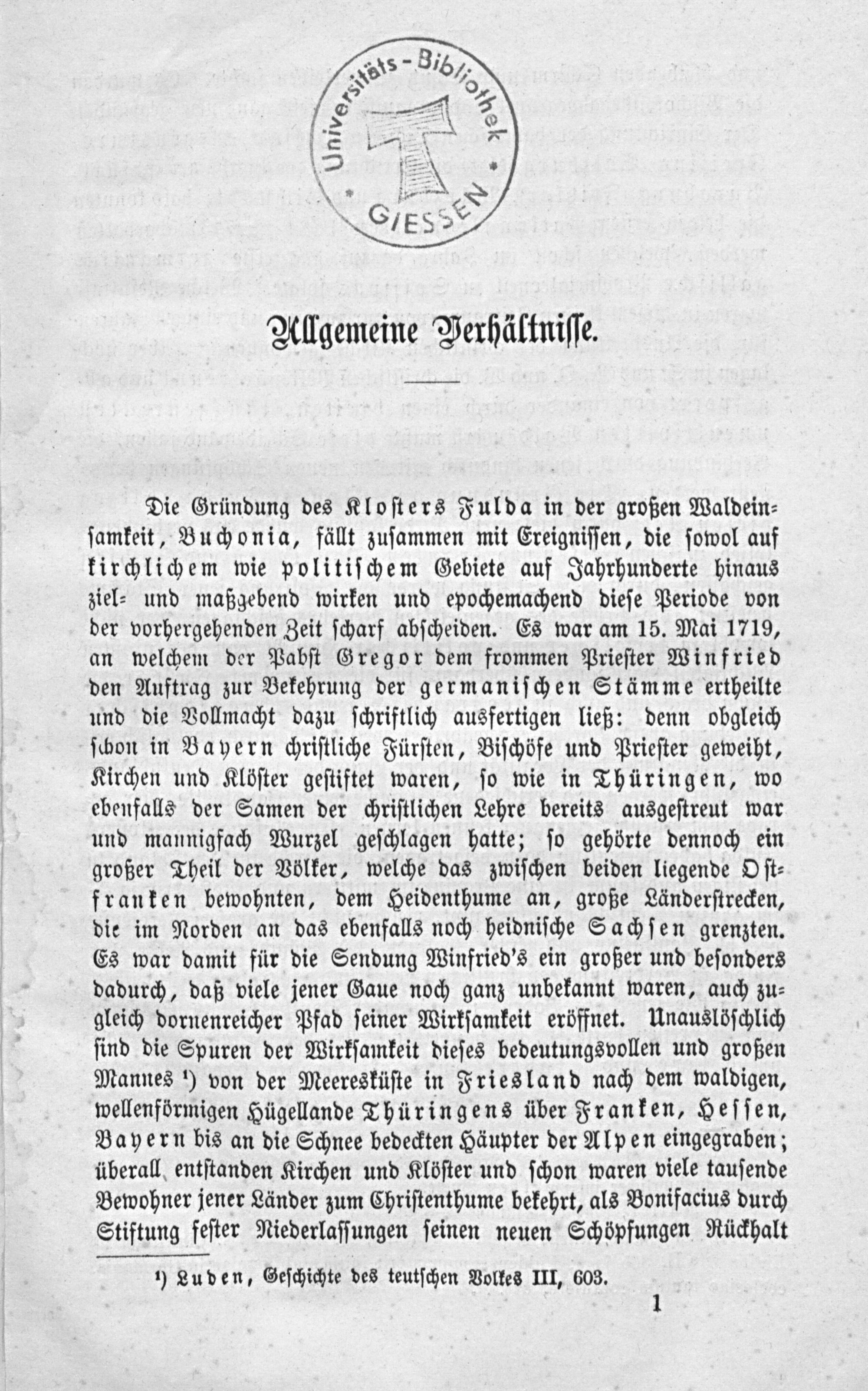 Die Gründung des Kloſters Fulda in der großen Waldein⸗ ſamkeit, Buchonia, fällt zuſammen mit Ereigniſſen, die ſowol auf kirchlichem wie politiſchem Gebiete auf Jahrhunderte hinaus ziel⸗ und maßgebend wirken und epochemachend dieſe Periode von der vorhergehenden Zeit ſcharf abſcheiden. Es war am 15. Mai 1719, an welchem der Pabſt Gregor dem frommen Prieſter Winfried den Auftrag zur Bekehrung der germaniſchen Stämme ertheilte und die Vollmacht dazu ſchriftlich ausfertigen ließ: denn obgleich ſchon in Bayern chriſtliche Fürſten, Biſchöfe und Prieſter geweiht, Kirchen und Klöſter geſtiftet waren, ſo wie in Thüringen, wo ebenfalls der Samen der chriſtlichen Lehre bereits ausgeſtreut war und mannigfach Wurzel geſchlagen hatte; ſo gehörte dennoch ein großer Theil der Völker, welche das zwiſchen beiden liegende Oſt⸗ franken bewohnten, dem Heidenthume an, große Länderſtrecken, die im Norden an das ebenfalls noch heidniſche Sachſen grenzten. Es war damit für die Sendung Winfried's ein großer und beſonders dadurch, daß viele jener Gaue noch ganz unbekannt waren, auch zu⸗ gleich dornenreicher Pfad ſeiner Wirkſamkeit eröffnet. Unauslöſchlich ſind die Spuren der Wirkſamkeit dieſes bedeutungsvollen und großen Mannes) von der Meeresküſte in Friesland nach dem waldigen, wellenförmigen Hügellande Thüringens über Franken, Heſſen, Bayern bis an die Schnee bedeckten Häupter der Alpen eingegraben; überall entſtanden Kirchen und Klöſter und ſchon waren viele tauſende Bewohner jener Länder zum Chriſtenthume bekehrt, als Bonifacius durch Stiftung feſter Niederlaſſungen ſeinen neuen Schöpfungen Rückhalt