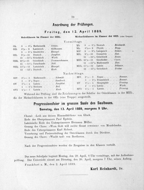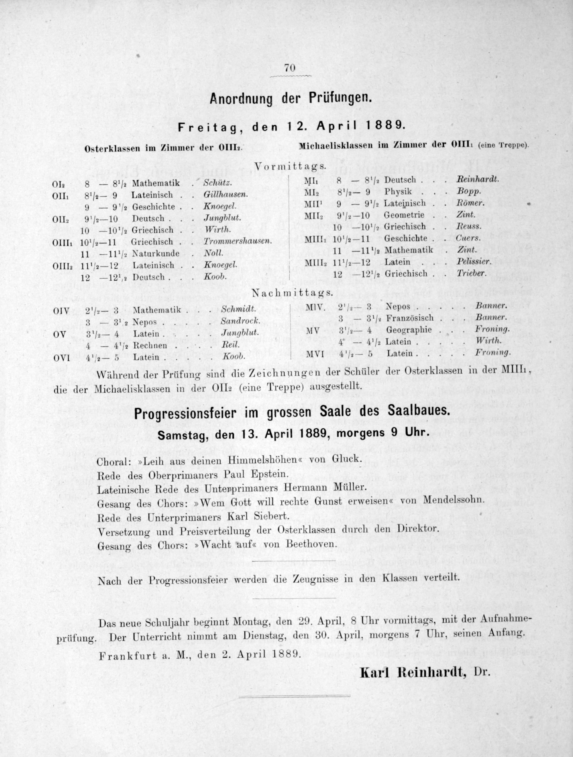 Frankfurt a. M., den 2. April 1889. Karl Reinhardt, Dr.