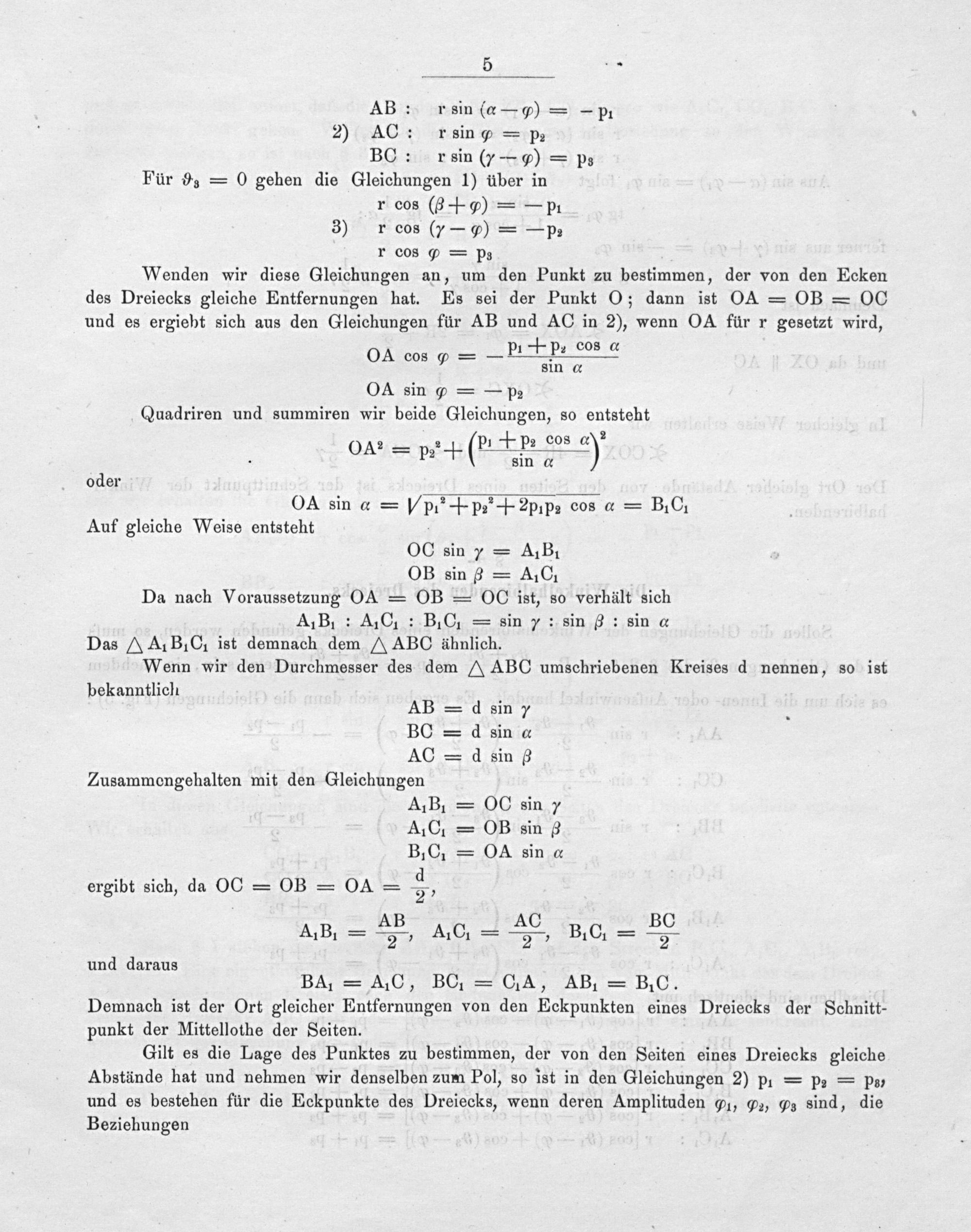 Gilt es die Lage des Punktes zu bestimmen, der von den Seiten eines Dreiecks gleiche Abstände hat und nehmen wir denselben zum Pol, so ist in den Gleichungen 2) pi= pa= po, und es bestehen für die Eckpunkte des Dreiecks, wenn deren Amplituden Gl, e,„s sind, die