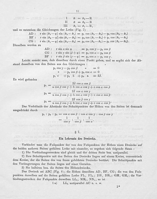 Verbindet man die Fuſspunkte der von den Fufspunkten der Höhen eines Dreiecks auf die beiden anderen Seiten gefällten Lothe mit einander, so ergeben sich folgende Sätze: