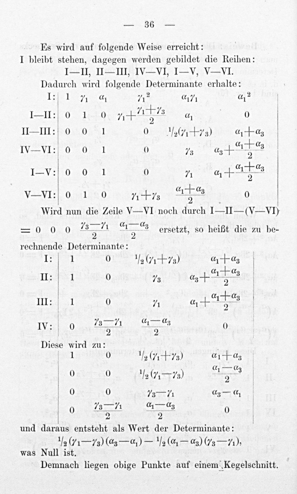 und daraus entsteht als Wert der Determinante: 1⁰½(1— 3)(a—.*⸗)— ½(r— da)(— 71), was Null ist. Demnach liegen obige Punkte auf einem Kegelschnitt.