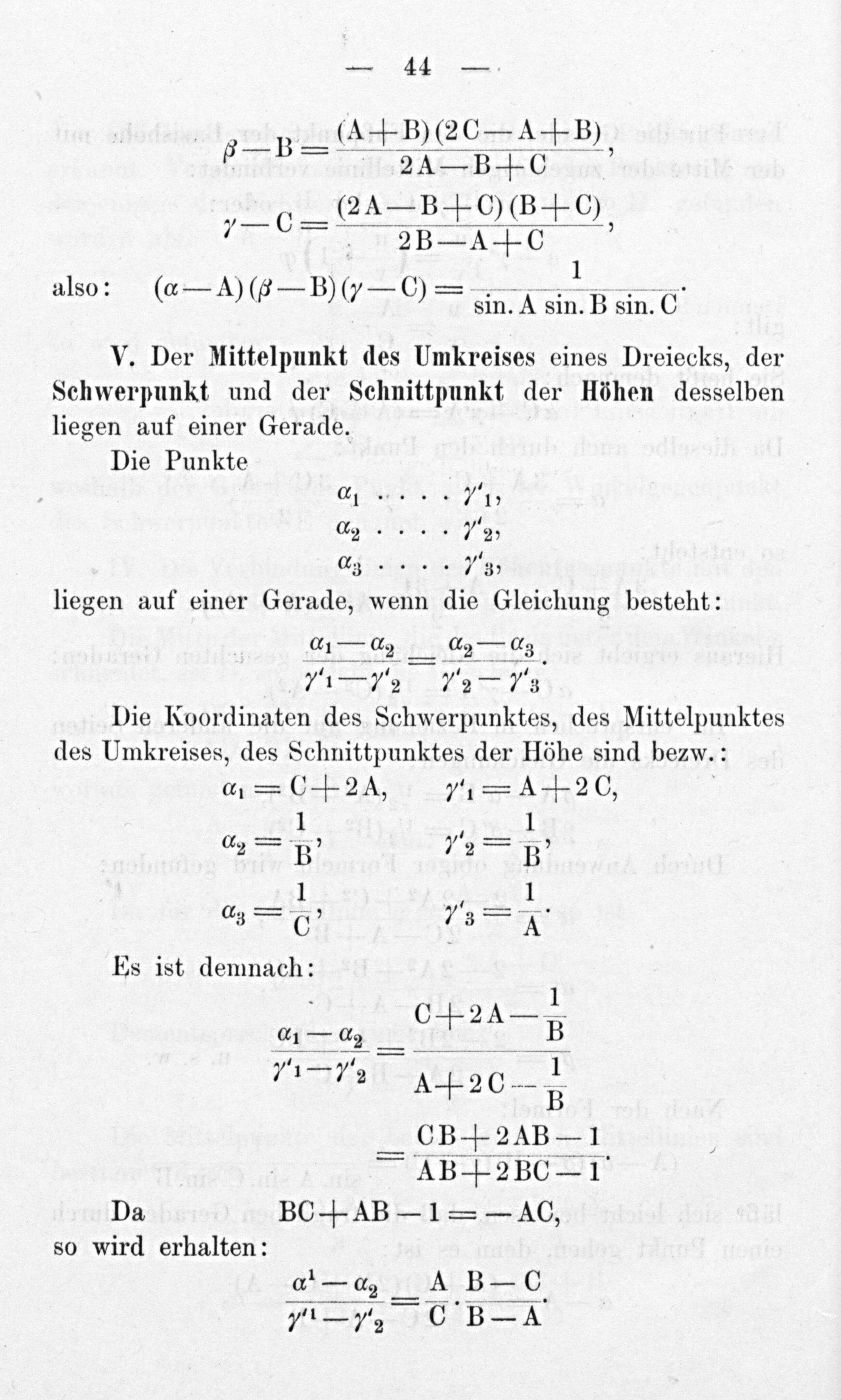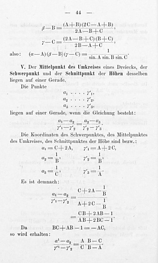 liegen auf einer Gerade, wenn die Gleichung besteht: 11².a. 22—. 71-nr 72 Die Koordinaten des Schwerpunktes, des Mittelpunktes des Umkreises, des Schnittpunktes der Höhe sind bezw.: