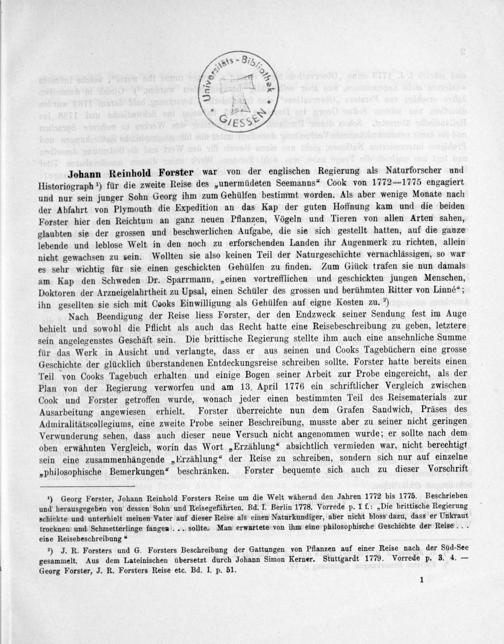 ¹) Georg Forster, Johann Reinhold Forsters Reise um die Welt wähernd den Jahren 1772 bis 1775. Beschrieben und herausgegeben von dessen Sohn und Reisegefährten. Bd. I. Berlin 1778. Vorrede p. 1 f.:„Die brittische Regierung schickte und unterhielt meinen Vater auf dieser Reise als einen Naturkundiger, aber nicht bloss dazu, dass er Unkraut trocknen und Schmetterlinge fangen... sollte. Man erwartete von ihm eine philosophische Geschichte der Reise... eine Reisebeschreibung“