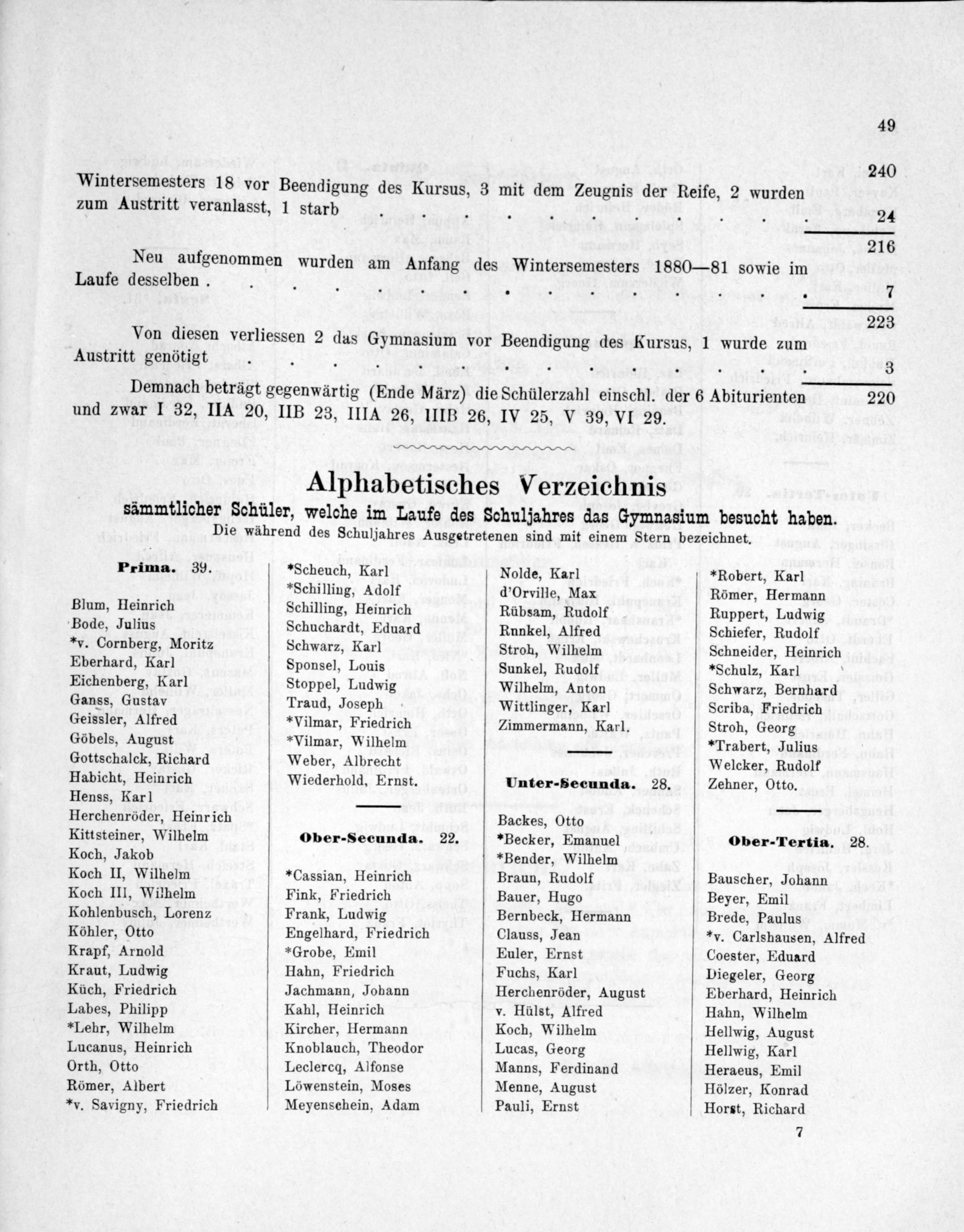 sämmtlicher Schüler, welche im Laufe des Schuljahres das Gymnasium besucht haben. Die während des Schuljahres Ausgetretenen sind mit einem Stern bezeichnet.