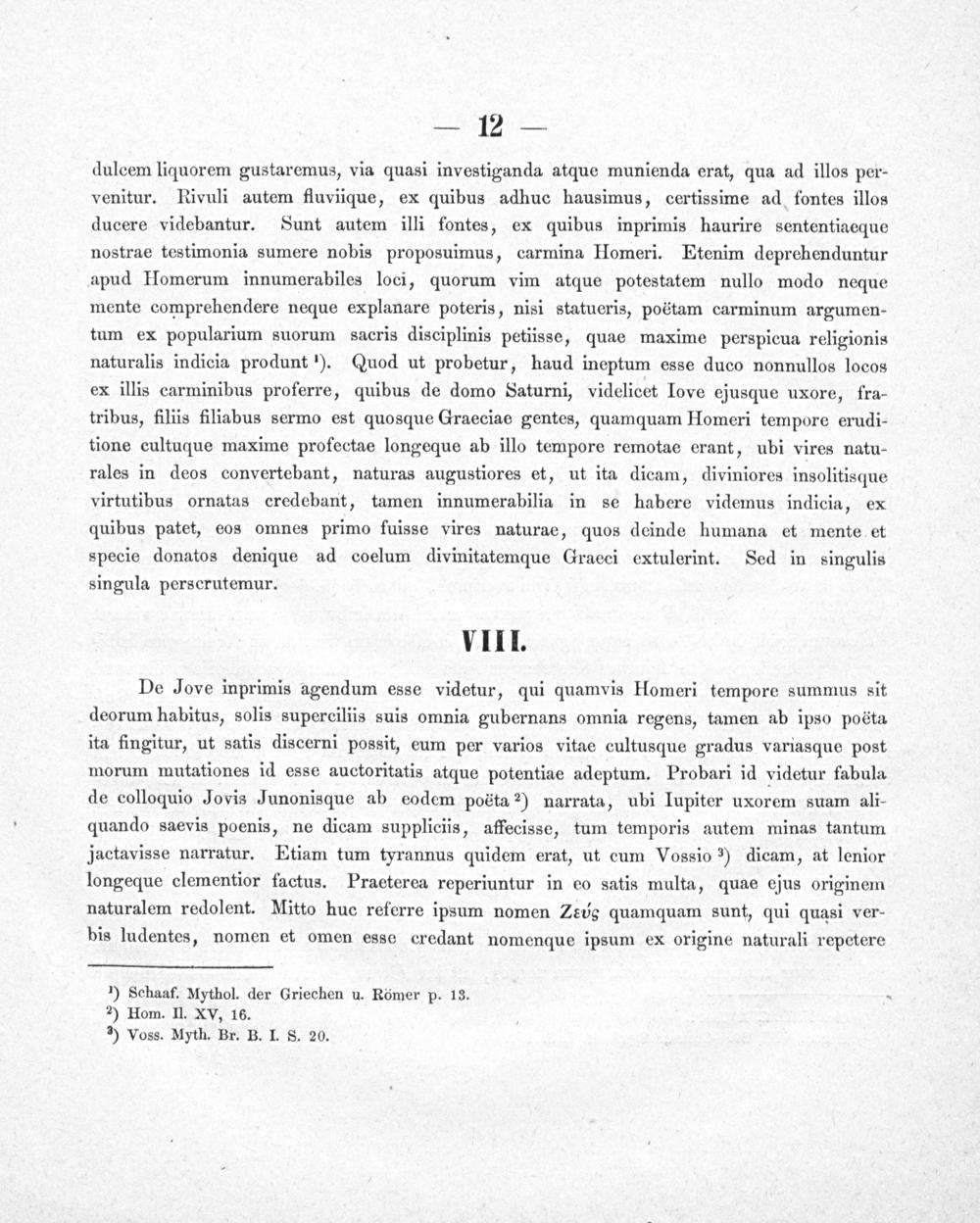 dulcem liquorem gustaremus, via quasi investiganda atque munienda erat, qua ad illos per- venitur. Rivuli autem fluviique, ex quibus adhuc hausimus, certissime ad fontes illos ducere videbantur. Sunt autem illi fontes, ex quibus inprimis haurire sententiaeque nostrae testimonia sumere nobis proposuimus, carmina Homeri. Etenim deprehenduntur apud Homerum innumerabiles loci, quorum vim atque potestatem nullo modo neque mente comprehendere neque explanare poteris, nisi statueris, poëtam carminum argumen- tum ex popularium suorum sacris disciplinis petiisse, quae maxime perspicua religionis naturalis indicia produnt¹). Quod ut probetur, haud ineptum esse duco nonnullos locos ex illis carminibus proferre, quibus de domo Saturni, videlicet Iove ejusque uxore, fra- tribus, filiis filiabus sermo est quosque Graeciae gentes, quamquam Homeri tempore erudi- tione cultuque maxime profectae longeque ab illo tempore remotae erant, ubi vires natu- rales in deos convertebant, naturas augustiores et, ut ita dicam, diviniores insolitisque virtutibus ornatas credebant, tamen innumerabilia in se habere videmus indicia, ex quibus patet, eos omnes primo fuisse vires naturae, quos deinde humana et mente et specie donatos denique ad coelum divinitatemque Graeci extulerint. Sed in singulis singula perscrutemur.