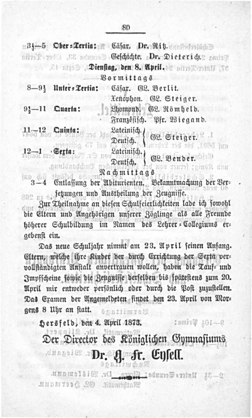 Hersfeld, den 4. April 1873. Der Direckor des Kö niglichen Eymmaſiumnz Dr.. Fr. Eyſell.