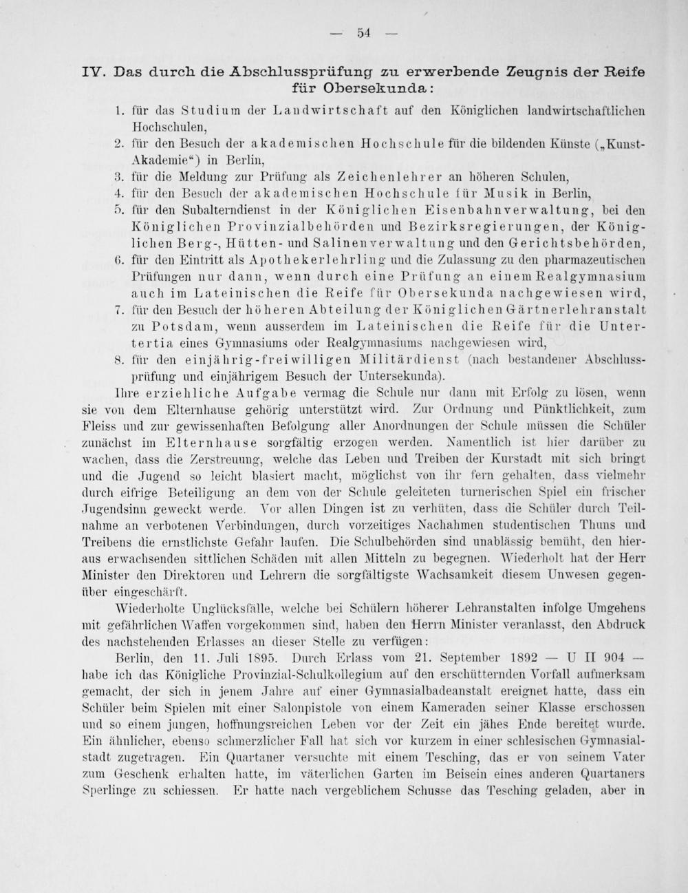Berlin, den 11. Juli 1895. Durch Erlass vom 21. September 1892— U II 904— habe ich das Königliche Provinzial-Schulkollegium auf den erschütternden Vorfall aufmerksam gemacht, der sich in jenem Jahre auf einer Gymnasialbadeanstalt ereignet hatte, dass ein Schüler beim Spielen mit einer Salonpistole von einem Kameraden seiner Klasse erschossen und so einem jungen, hoffnungsreichen Leben vor der Zeit ein jähes Ende bereitet wurde. Ein ähnlicher, ebenso schmerzlicher Fall hat sich vor kurzem in einer schlesischen Gymnasial- stadt zugetragen. Ein Quartaner versuchte mit einem Tesching, das er von seinem Vater zum Geschenk erhalten hatte, im väterlichen Garten im Beisein eines anderen Quartaners Sberlinge zu schiessen. Er hatte nach vergeblichem Schusse das Tesching geladen, aber in