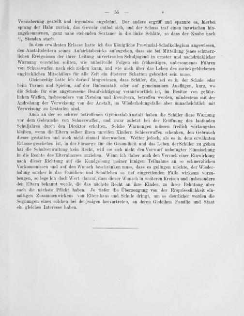 In dem erwähnten Erlasse hatte ich das Königliche Provinzial-Schulkollegium angewiesen, den Anstaltsleitern seines Aufsichtsbezirks aufzugeben, dass sie bei Mitteilung jenes schmerz- lichen Ereignisses der ihrer Leitung anvertrauten Schuljugend in ernster und nachdrücklicher Warnung vorstellen sollten, wie unheilvolle Folgen ein frühzeitiges, unbesonnenes Führen von Schusswaffen nach sich ziehen kann, und wie auch über das Leben des zurückgebliebenen unglücklichen Mitschülers für alle Zeit ein düsterer Schatten gebreitet sein muss.
