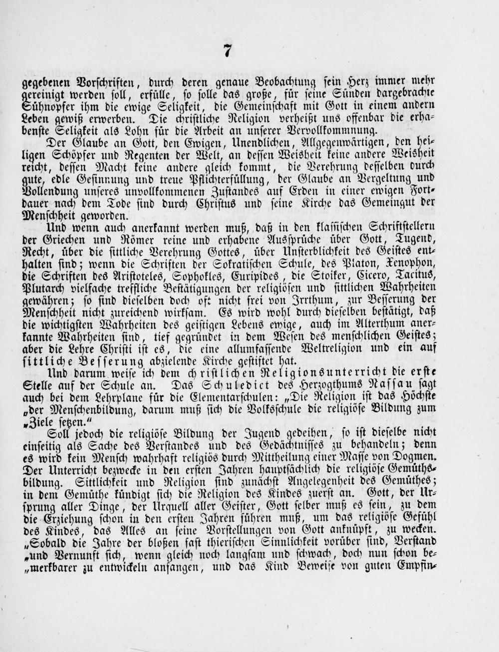 Und wenn auch anerkannt werden muß, daß in den klaſſiſchen Schriftſtellern der Griechen und Römer reine und erhabene Ausſprüche über Gott, Tugend, Recht, uͤber die ſittliche Verehrung Gottes, über Unſterblichkeit des Geiſtes ent⸗ halten ſind; wenn die Schriften der Sokratiſchen Schule, des Platon, Tenophon, die Schriften des Ariſtoteles, Sophokles, Euripides, die Stoiker, Cicero, Tacitus, Plutarch vielfache treffliche Beſtätigungen der religiöſen und ſittlichen Wahrheiten gewähren; ſo ſind dieſelben doch oft nicht frei von Irrthum, zur Beſſerung der Menſchheit nicht zureichend wirkſam. Es wird wohl durch dieſelben beſtätigt, daß die wichtigſten Wahrheiten des geiſtigen Lebens ewige, auch im Alterthum aner⸗ kannte Wahrheiten ſind, tief gegründet in dem Weſen des menſchlichen Geiſtes; aber die Lehre Chriſti iſt es, die eine allumfaſſende Weltreligion und ein auf ſittliche Beſſerung abjielende Kirche geſtiftet hat.