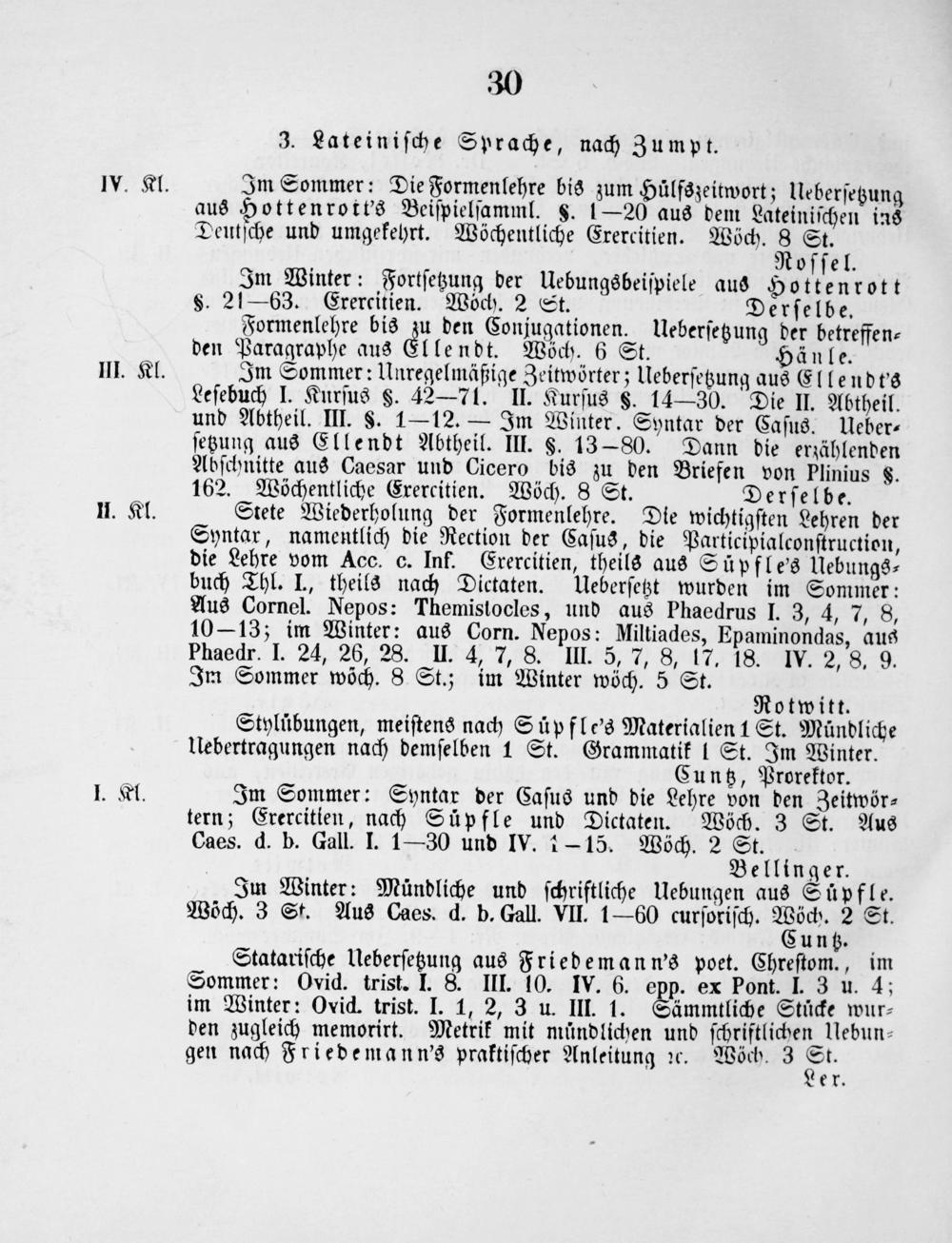 Im Sommer: Die Formenlehre bis zum Huͤlfszeitwort; Ueberſetzung aus Hottenrott's Beiſpielſamml.§. 1— 20 aus dem Lateiniſchen ins Deutſche und umgekehrt. Wöchentliche Erercitien. Wöch. 8 St.