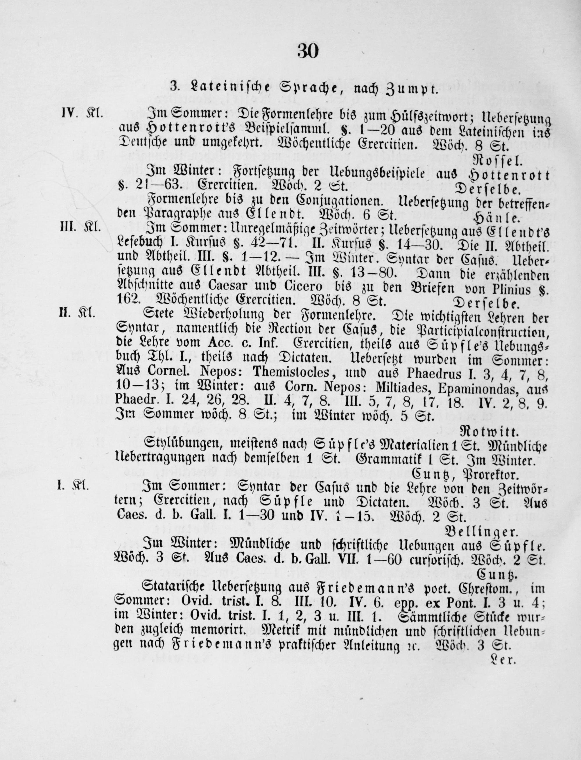 Im Sommer: Syntar der Caſus und die Lehre von den Zeitwör⸗ tern; Erercitien, nach Süpfle und Dictaten. Wöch. 3 St. Aus Caes. d. b. Gall. I. 1—30 und IV. 1— 15. Wöch. 2 St.