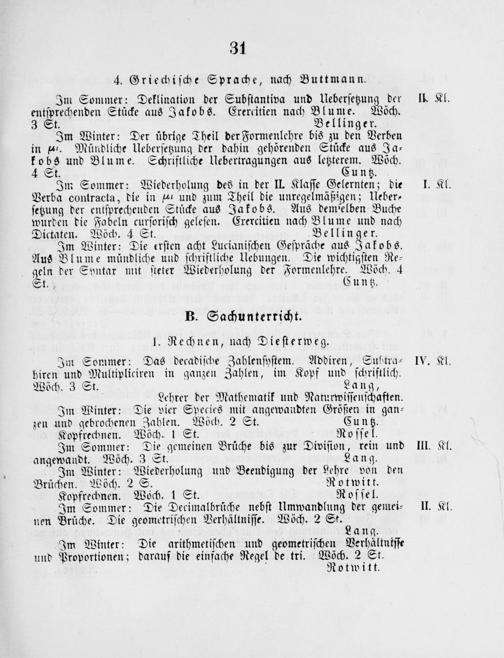 Im Sommer: Deklination der Subſtantiva und Ueberſetzung der II Kl. entſprechenden Stuͤcke aus Jakobs. Erercitien nach Blume. Wöch. 3 St. Bellinger. Im Winter: Der übrige Theil der Formenlehre bis zu den Verben in ³. Mündliche Ueberſetzung der dahin gehörenden Stücke aus Ja⸗ kobs und Blume. Schriftliche Uebertragungen aus letzterem. Wöch. 4 St. Cuntz. Im Sommer: Wiederholung des in der II. Klaſſe Gelernten; die I. Kl. Verba contracta, die in ‿ι und zum Theil die unregelmäßigen; Ueber⸗ ſetzung der entſprechenden Stucke aus Jakobs. Aus demſelben Buche wurden die Fabeln curſoriſch geleſen. Exercitien nach Blume und nach Dictaten. Wöch. 4 St. Bellinger. Im Winter: Die erſten acht Lucianiſchen Geſpräche aus Jakobs. Aus Blume mündliche und ſchriftliche Uebungen. Die wichtigſten Re⸗ geln der Syntar mit ſteter Wiederholung der Furmenleis. Wöch. 4 St.) Cuntz.