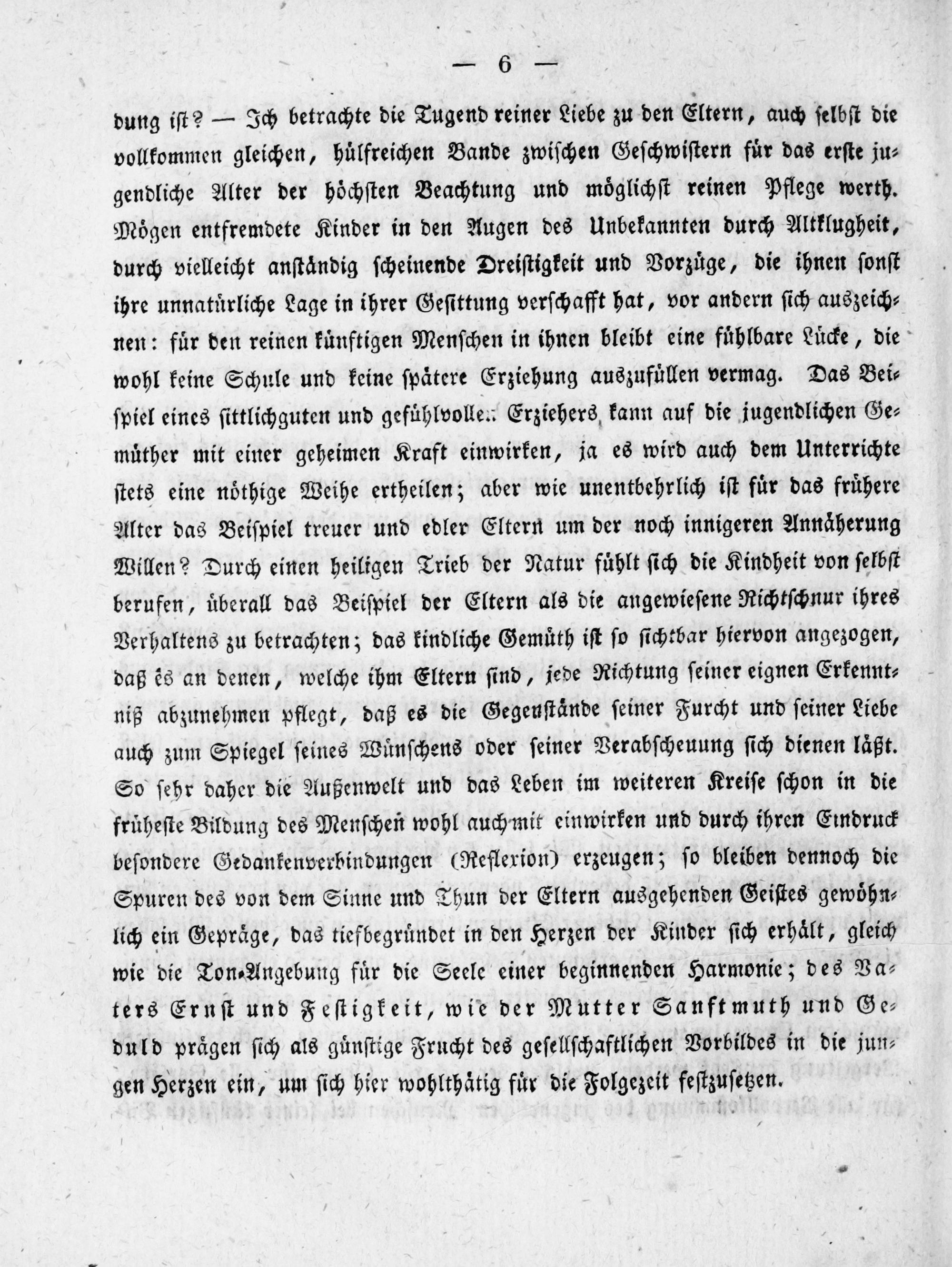 dung iſt?— Ich betrachte die Tugend reiner Liebe zu den Eltern, auch ſelbſt die vollkommen gleichen, huͤlfreichen Bande zwiſchen Geſchwiſtern fuͤr das erſte ju⸗ gendliche Alter der hoͤchſten Beachtung und moͤglichſt reinen Pflege werth. Moͤgen entfremdete Kinder in den Augen des Unbekannten durch Altklugheit, durch vielleicht anſtaͤndig ſcheinende Dreiſtigkeit und Vorzuͤge, die ihnen ſonſt ihre unnatuͤrliche Lage in ihrer Geſittung verſchafft hat, vor andern ſich auszeich⸗ nen: fuͤr den reinen kuͤnftigen Menſchen in ihnen bleibt eine fuͤhlbare Luͤcke, die wohl keine Schule und keine ſpaͤtere Erziehung auszufuͤllen vermag. Das Bei⸗ ſpiel eines ſittlichguten und gefuͤhlvollen Erziehers kann auf die jugendlichen Ge⸗ muͤther mit einer geheimen Kraft einwirken, ja es wird auch dem Unterrichte ſtets eine noͤthige Weihe ertheilen; aber wie unentbehrlich iſt fuͤr das fruͤhere Alter das Beiſpiel treuer und edler Eltern um der noch innigeren Annaͤherung Willen? Durch einen heiligen Trieb der Natur fuͤhlt ſich die Kindheit von ſelbſt berufen, uͤberall das Beiſpiel der Eltern als die angewieſene Richtſchnur ihres Verhaltens zu betrachten; das kindliche Gemuͤth iſt ſo ſichtbar hiervon angezogen, daß is an denen, welche ihm Eltern ſind, jede Richtung ſeiner eignen Erkennt⸗ niß abzunehmen pflegt, daß es die Gegeuſtaͤnde ſeiner Furcht und ſeiner Liebe auch zum Spiegel ſeines Wuͤnſchens oder ſeiner Verabſcheuung ſich dienen laͤßt. So ſehr daher die Außenwelt und das Leben im weiteren Kreiſe ſchon in die fruͤheſte Bildung des Menſchen wohl auchmit einwirken und durch ihren Eindruck beſondere Gedankenverbindungen(Reflexion) erzeugen; ſo bleiben dennoch die Spuren des von dem Sinne und Thun der Eltern ausgehenden Geiſtes gewoͤhn⸗ lich ein Gepraͤge, das tiefbegruͤndet in den Herzen der Kinder ſich erhaͤlt, gleich wie die Ton⸗Angebung fuͤr die Seele einer beginnenden Harmonie; des Va⸗ ters Ernſt und Feſtigkeit, wie der Mutter Sanftmuth und Ge⸗ duld praͤgen ſich als guͤnſtige Frucht des geſellſchaftlichen Vorbildes in die jun⸗ gen Herzen ein, um ſich hier wohlthaͤtig fuͤr die Folgezeit feſtzuſetzen.