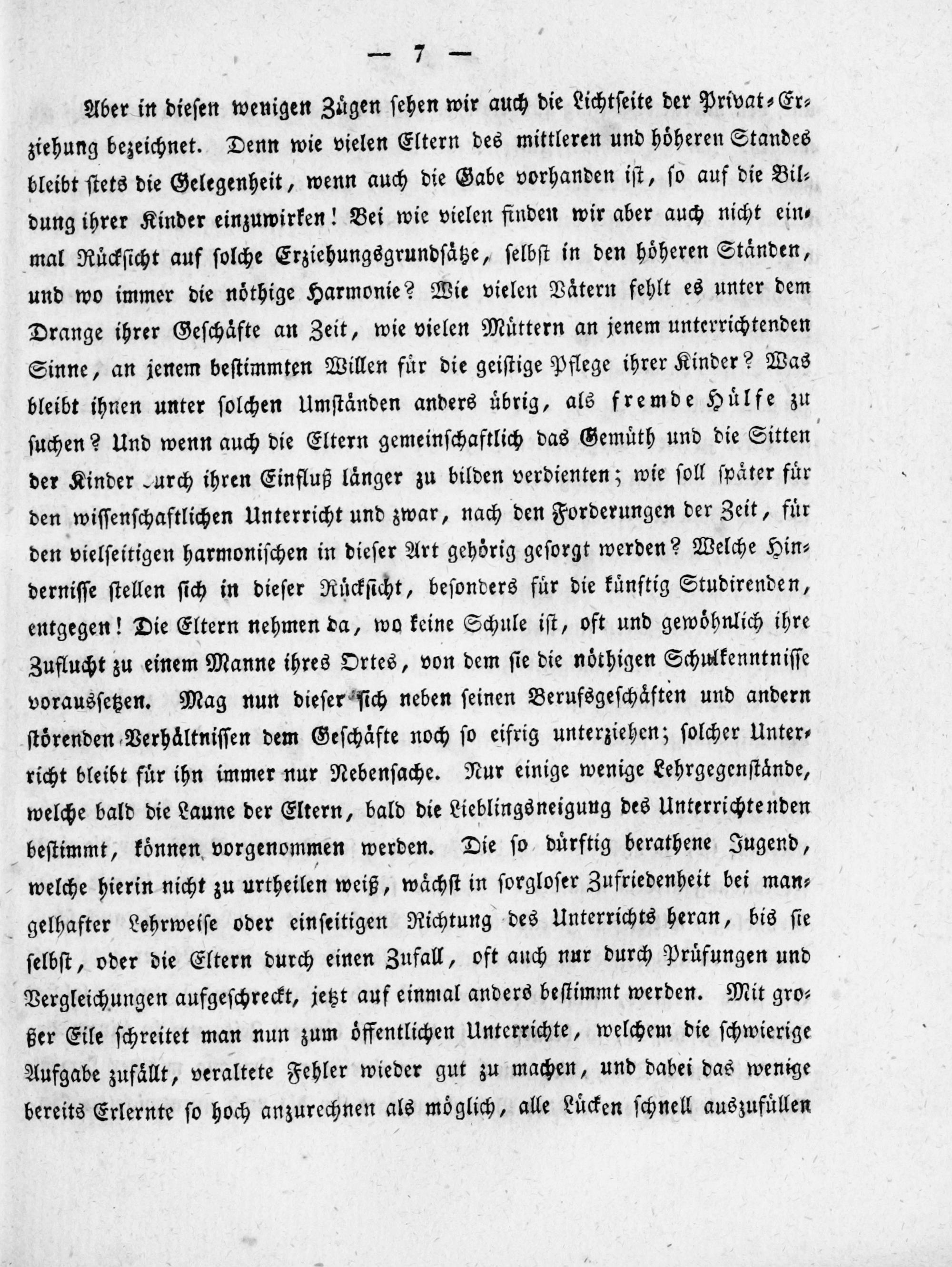 Aber in dieſen wenigen Zuͤgen ſehen wir auch die Lichtſeite der Privat⸗Er⸗ ziehung bezeichnet. Denn wie vielen Eltern des mittleren und hoͤheren Standes bleibt ſtets die Gelegenheit, wenn auch die Gabe vorhanden iſt, ſo auf die Bil⸗ dung ihrer Kinder einzuwirken! Bei wie vielen finden wir aber auch nicht ein⸗ mal Ruͤckſicht auf ſolche Erziehungsgrundſaͤtze, ſelbſt in den hoͤheren Staͤnden, und wo immer die nöthige Harmonie? Wie vielen Vaͤtern fehlt es unter dem Drange ihrer Geſchaͤfte an Zeit, wie vielen Muͤttern an jenem unterrichtenden Sinne, an jenem beſtimmten Willen fuͤr die geiſtige Pflege ihrer Kinder? Was bleibt ihnen unter ſolchen Umſtaͤnden anders uͤbrig, als fremde Huͤlfe zu ſuchen? Und wenn auch die Eltern gemeinſchaftlich das Gemuͤth und die Sitten der Kinder„urch ihren Einfluß laͤnger zu bilden verdienten; wie ſoll ſpaͤter fuͤr den wiſſenſchaftlichen Unterricht und zwar, nach den Forderungen der Zeit, fuͤr den vielſeitigen harmoniſchen in dieſer Art gehoͤrig geſorgt werden? Welche Hin⸗ derniſſe ſtellen ſich in dieſer Ruͤckſicht, beſonders fuͤr die kuͤnftig Studirenden, entgegen! Die Eltern nehmen da, wo keine Schule iſt, oft und gewoͤhnlich ihre Zuflucht zu einem Manne ihres Ortes, von dem ſie die noͤthigen Schulkenntniſſe vorausſetzen. Mag nun dieſer ſich neben ſeinen Berufsgeſchaͤften und andern ſtoͤrenden Verhäͤltniſſen dem Geſchaͤfte noch ſo eifrig unterziehen; ſolcher Unter⸗ richt bleibt fuͤr ihn immer nur Nebenſache. Nur einige wenige Lehrgegenſtaͤnde, welche bald die Laune der Eltern, bald die Lieblingsneigung des Unterrichtenden beſtimmt, koͤnnen vorgenommen werden. Die ſo duͤrftig berathene Jugend, welche hierin nicht zu urtheilen weiß, waͤchſt in ſorgloſer Zufriedenheit bei man⸗ gelhafter Lehrweiſe oder einſeitigen Richtung des Unterrichts heran, bis ſie ſelbſt, oder die Eltern durch einen Zufall, oft auch nur durch Pruͤfungen und Vergleichungen aufgeſchreckt, jetzt auf einmal anders beſtimmt werden. Mit gro⸗ ßer Eile ſchreitet man nun zum oͤffentlichen Unterrichte, welchem die ſchwierige Aufgabe zufaͤllt, veraltete Fehler wieder gut zu machen, und dabei das wenige bereits Erlernte ſo hoch anzurechnen als moͤglich, alle Luͤcken ſchnell auszufuͤllen