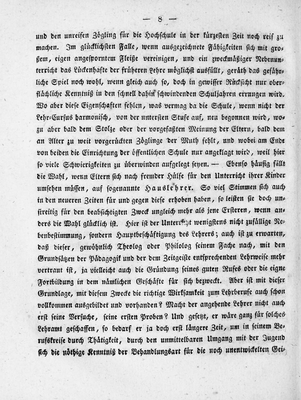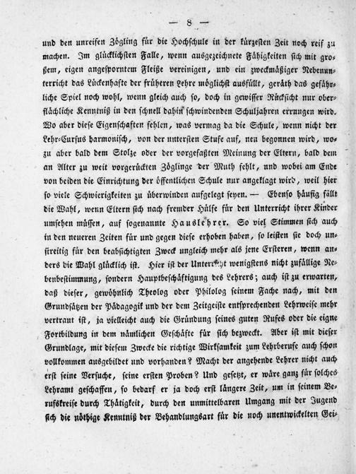 und den unreifen Zoͤgling fuͤr die Hochſchule in der kuͤrzeſten Zeit noch reif zu machen. Im gluͤcklichſten Falle, wenn ausgezeichnete Faͤhigkeiten ſich mit gro⸗ ßem, eigen angeſporntem Fleiße vereinigen, und ein zweckmaͤßiger Nebenun⸗ terricht das Luͤckenhafte der fruͤheren Lehre moͤglichſt ausfuͤllt, geraͤth das gefaͤhr⸗ liche Spiel noch wohl, wenn gleich auch ſo, doch in gewiſſer Ruͤckſicht nur ober⸗ flaͤchliche Kenntniß in den ſchnell dahin ſchwindenden Schuljahren errungen wird. Wo aber dieſe Eigenſchaften fehlen, was vermag da die Schule, wenn nicht der Lehr⸗Curſus harmoniſch, von der unterſten Stufe auf, neu begonnen wird, wo⸗ zu aber bald dem Stolze oder der vorgefaßten Meinung der Eltern, bald dem an Alter zu weit vorgeruͤckten Zoͤglinge der Muth fehlt, und wobei am Ende von beiden die Einrichtung der oͤffentlichen Schule nur angeklagt wird, weil hier ſo viele Schwierigkeiten zu uͤberwinden aufgelegt ſeyen.— Ebenſo haͤufig fällt die Wahl, wenn Eltern ſich nach fremder Huͤlfe fuͤr den Unterricht ihrer Kinder umſehen muͤſſen, auf ſogenannte Hauslehrer. So viel Stimmen ſich auch in den neueren Zeiten fuͤr und gegen dieſe erhoben haben, ſo leiſten ſie doch un⸗ ſtreitig fuͤr den beabſichtigten Zweck ungleich mehr als jene Erſteren, wenn an⸗ ders die Wahl gluͤcklich iſt. Hier iſt der Unterreeht wenigſtens nicht zufaͤllige Ne⸗ benbeſtimmung, ſondern Hauptbeſchaͤftigung des Lehrers; auch iſt zu erwarten, daß dieſer, gewoͤhnlich Theolog oder Philolog ſeinem Fache nach, mit den Grundſaͤtzen der Paͤdagogik und der dem Zeitgeiſte entſprechenden Lehrweiſe mehr vertraut iſt, ja vielleicht auch die Gruͤndung ſeines guten Rufes oder die eigne Fortbildung in dem naͤmlichen Geſchaͤfte fuͤr ſich bezweckt. Aber iſt mit dieſer Grundlage, mit dieſem Zwecke die richtige Wirkſamkeit zum Lehrberufe auch ſchon vollkommen ausgebildet und vorhanden? Macht der angehende Lehrer nicht auch erſt ſeine Verſuche, ſeine erſten Proben? Und geſetzt, er waͤre ganz fuͤr ſolches Lehramt geſchaffen, ſo bedarf er ja doch erſt laͤngere Zeit, um in ſeinem Be⸗ rufskreiſe durch Thaͤtigkeit, durch den unmittelbaren Umgang mit der Jugend ſich die nothige Kenntniß der Behandlungsart fuͤr die noch unentwickelten Gei⸗