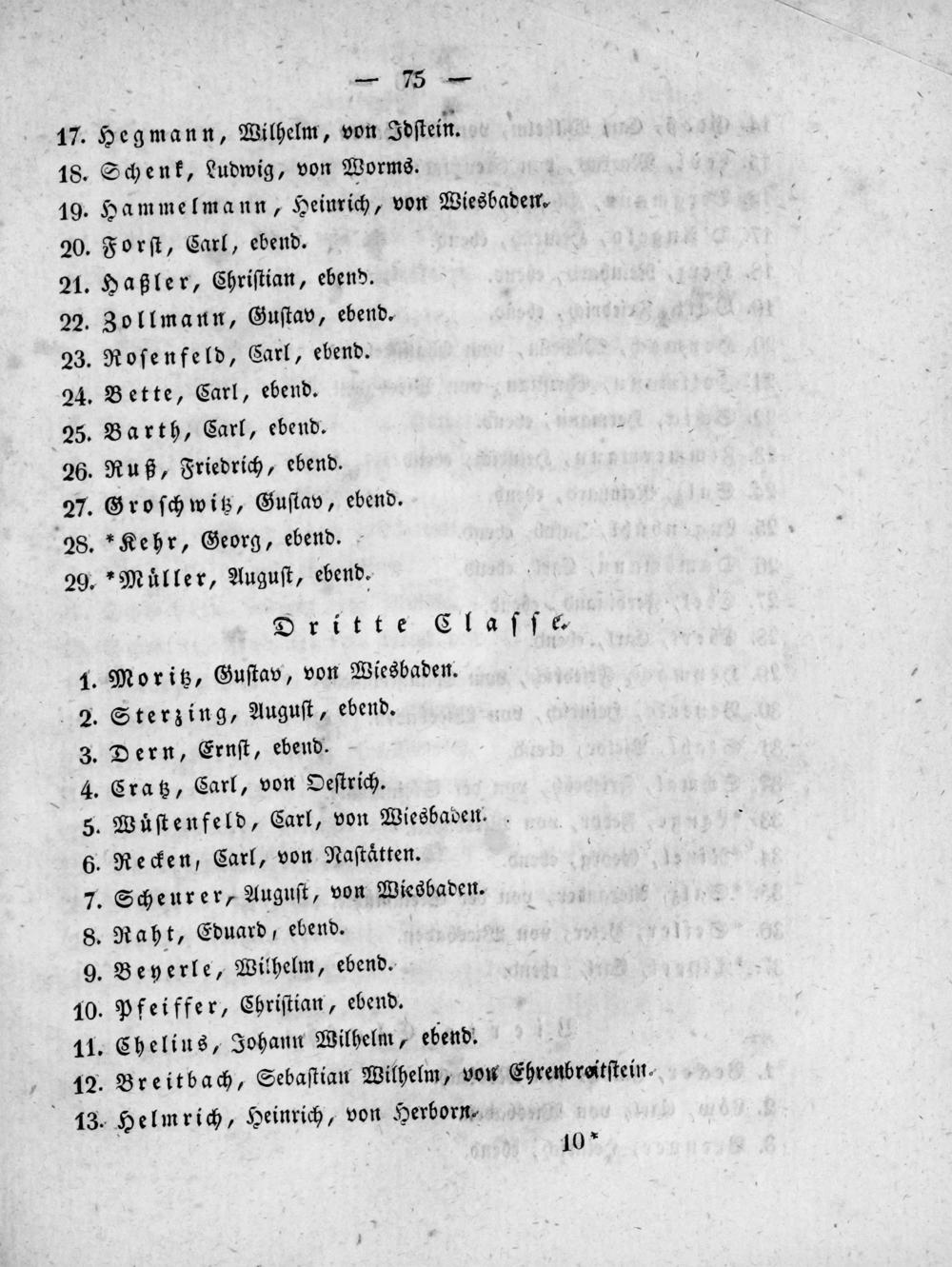 17. Hegmann, Wilhelm, von Idſtein. 18. Schenk, Ludwig, von Worms. 19. Hammelmann, Heinrich, von Wiesbaden. 20. Forſt, Carl, ebend. 21. Haßler, Chriſtian, ebend. 22. Zollmann, Guſtav, ebend. 23. Roſenfeld, Carl, ebend. 24. Bette, Carl, ebend. 25. Barth, Carl, ebend.— 26. Ruß, Friedrich, ebend. 27. Groſchwitz, Guſtav, ebend. 28.Kehr, Georg, ebend. 29.*Muͤller, Auguſt, ebend. Dritte Claſſe. Moritz, Guſtav, von Wiesbaden. „Sterzing, Auguſt, ebend. Dern, Ernſt, ebend. Cratz, Carl, von Oeſtrich. Wuͤſtenfeld, Carl, von Wiesbaden. Recken, Carl, von Naſtaͤtten. Scheurer, Auguſt, von Wiesbaden. Raht, Eduard, ebend. Beyerle, Wilhelm, ebend. 10. Pfeiffer, Chriſtian, ebend. 11. Chelius, Johann Wilhelm, ebend. 12. Breitbach, Sebaſtian Wilhelm, von Ehrenbraitſtein. 13. Helm rich, Heinrich, von Herborn⸗