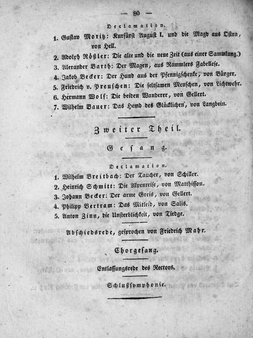2. Adolph Roͤßler: Die alte und die neue Zeit(aus einer Sammlung) 3. Alexander Barth: Der Magen, aus Rammlers Fabelleſe. 4. Jakob Becker: Der Hund aus der Pfennigſchenke, von Buͤrger. 5. Friedrich v. Preuſchen: Die ſeltſamen Menſchen, von Lichtwehr. 6. Hermann Wolf: Die beiden Wanderer, von Gellert. 7. Wilhelm Bauer: Das Hemd des Gluͤcklichen, von Langbein.