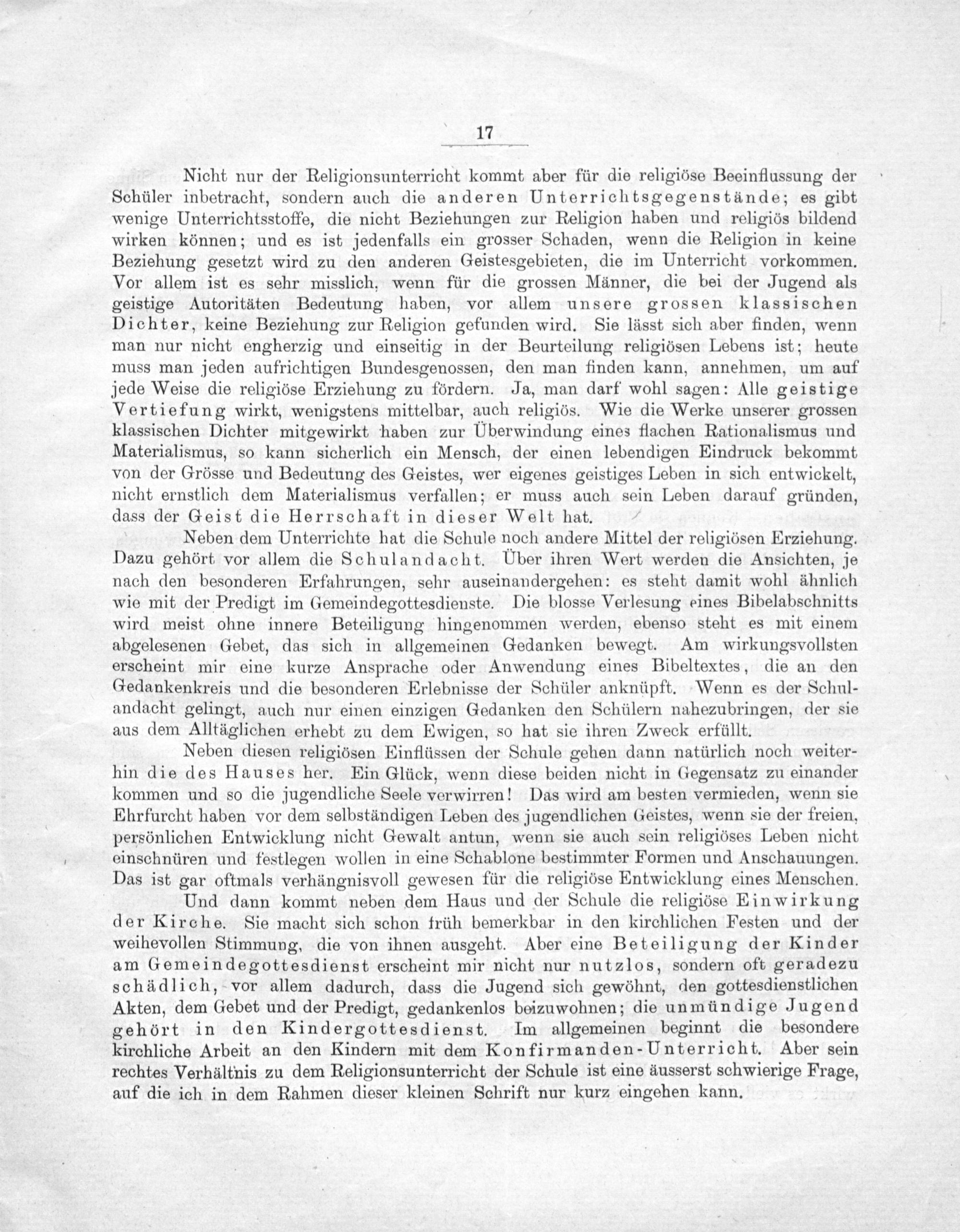Und dann kommt neben dem Haus und der Schule die religiöse ELinwirkung der Kirche. Sie macht sich schon früh bemerkbar in den kirchlichen Festen und der weihevollen Stimmung, die von ihnen ausgeht. Aber eine Beteiligung der Kinder am Gemeindegottesdienst erscheint mir nicht nur nutzlos, sondern oft geradezu schädlich, vor allem dadurch, dass die Jugend sich gewöhnt, den gottesdienstlichen Akten, dem Gebet und der Predigt, gedankenlos beizuwohnen; die unmündige Jugend gehört in den Kindergottesdienst. Im allgemeinen beginnt die besondere kirchliche Arbeit an den Kindern mit dem Konfirmanden-Unterricht. Aber sein rechtes Verhältnis zu dem Religionsunterricht der Schule ist eine äusserst schwierige Frage, auf die ich in dem Rahmen dieser kleinen Schrift nur kurz eingehen kann.