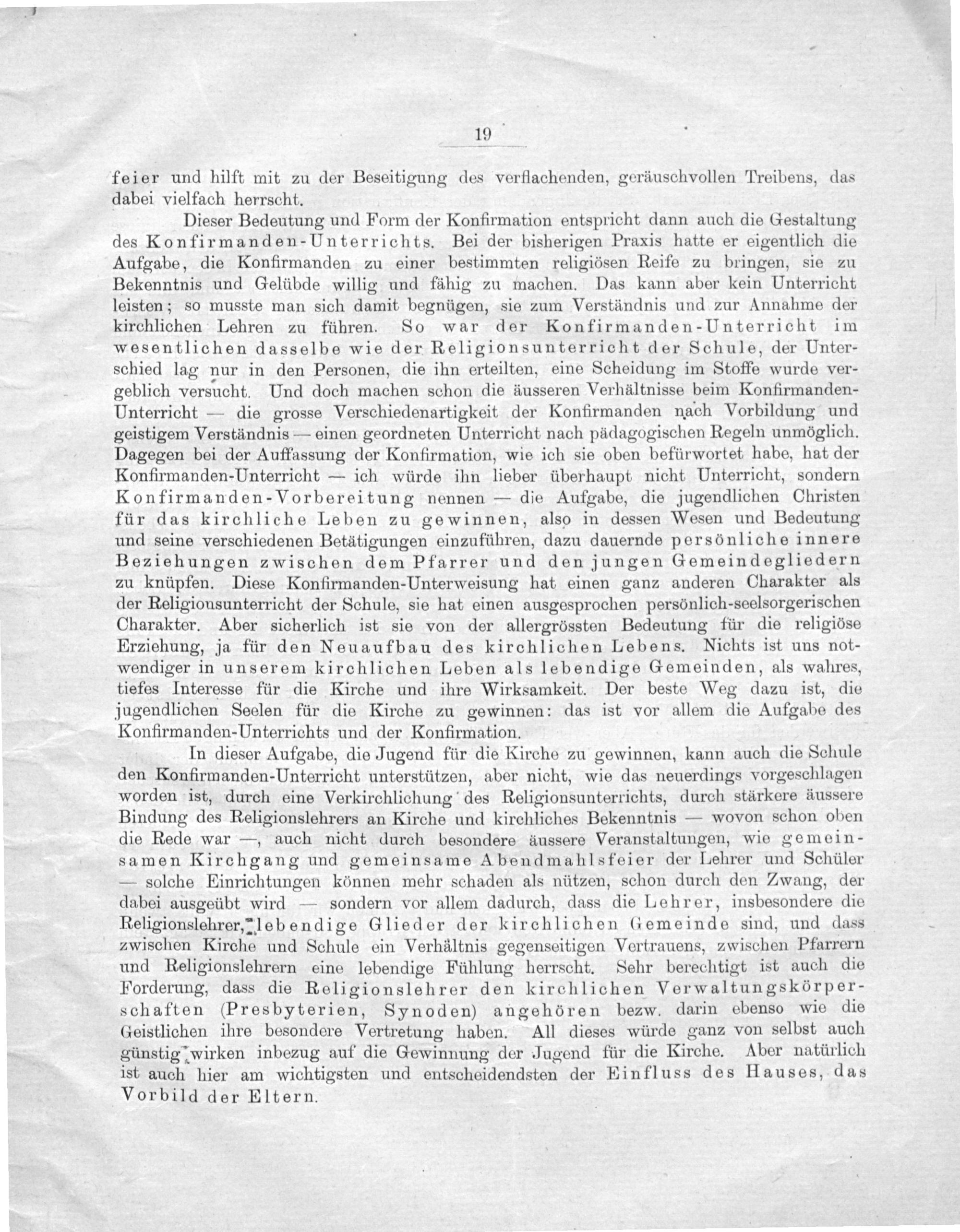 In dieser Aufgabe, die Jugend für die Kirche zu gewinnen, kann auch die Schule den Konfirmanden-Unterricht unterstützen, aber nicht, wie das neuerdings vorgeschlagen worden ist, durch eine Verkirchlichung des Religionsunterrichts, durch stärkere äussere