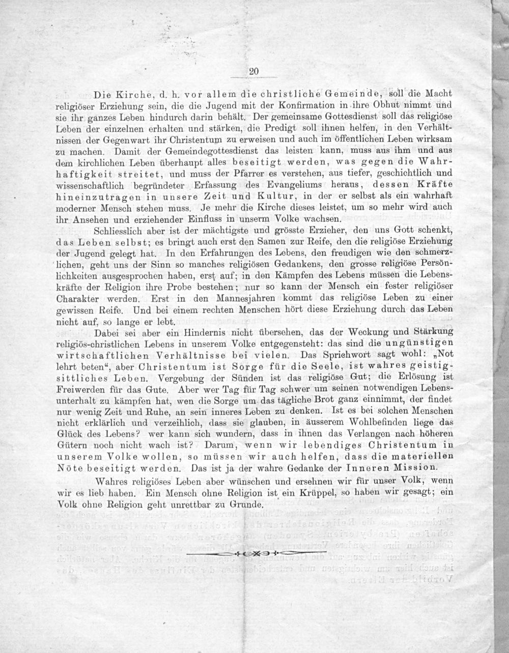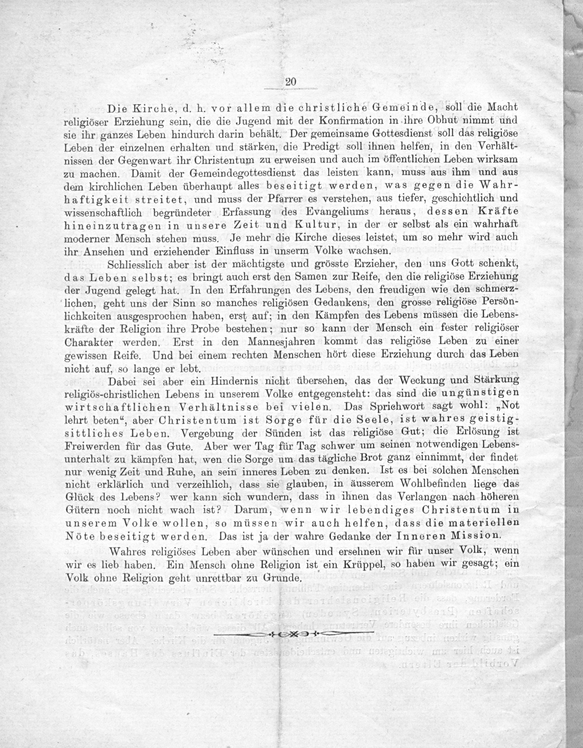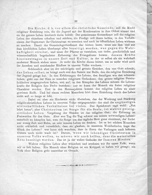 Die Kirche, d. h. vor allem die christliche Gemeinde, soll die Macht religiöser Erziehung sein, die die Jugend mit der Konfirmation in ihre Obhut, nimmt und sie ihr ganzes Leben hindurch darin behält. Der gemeinsame Gottesdienst soll das religiöse Leben der einzelnen erhalten und stärken, die Predigt soll ihnen helfen, in den Verhält- nissen der Gegenwart ihr Christentum zu erweisen und auch im öffentlichen Leben wirksam zu machen. Damit der Gemeindegottesdienst das leisten kann, muss aus ihm und aus dem kirchlichen Leben überhaupt alles beseitigt werden, was gegen die Wahr- haftigkeit streitet, und muss der Pfarrer es verstehen, aus tiefer, geschichtlich und wissenschaftlich begründeter Erfassung des Evangeliums heraus, dessen Krafte hineinzutragen in unsere Zeit und Kultur, in der er selbst als ein wahrhaft moderner Mensch stehen muss. Je mehr die Kirche dieses leistet, um so mehr wird auch ihr Ansehen und erziehender Einfluss in unserm Volke wachsen.
