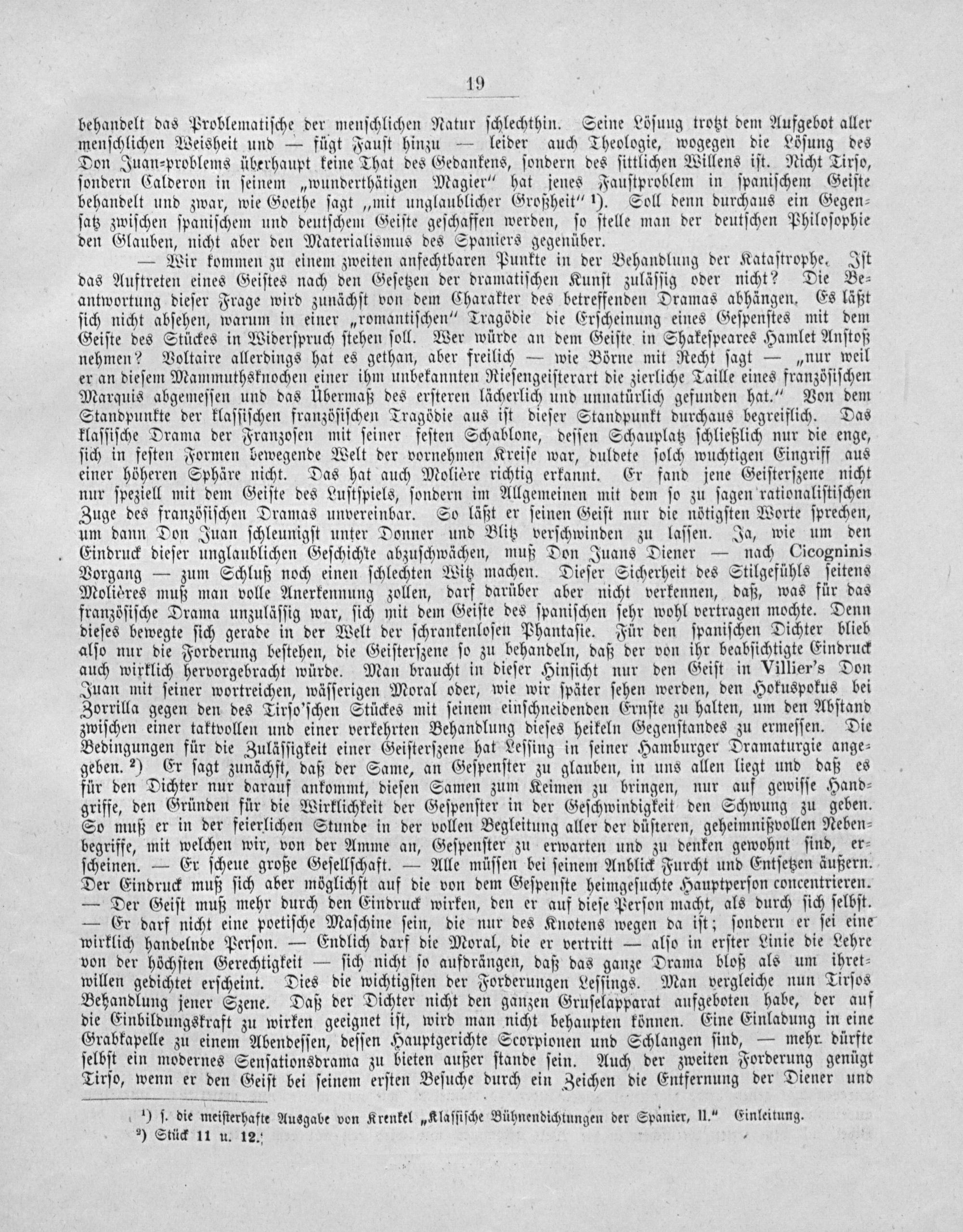 19 behandelt das Problematiſche der menſchlichen Natur ſchlechthin. Seine Löſuug trotzt dem Aufgebot aller menſchlichen Weisheit und— fügt Fauſt hinzu— leider auch Theologie, wogegen die Löſung des Don Juan⸗problems überhaupt keine That des Gedankens, ſondern des ſittlichen Willens iſt. Nicht Tirſo, ſondern Calderon in ſeinem„wunderthätigen Magier“ hat jenes Fauſtproblem in ſpaniſchem Geiſte behandelt und zwar, wie Goethe ſagt„mit unglaublicher Großheit“ ¹). Soll denn durchaus ein Gegen⸗ ſatz zwiſchen ſpaniſchem und deutſchem Geiſte geſchaffen werden, ſo ſtelle man der deutſchen Philoſophie den Glauben, nicht aber den Materialismus des Spaniers gegenüber.
