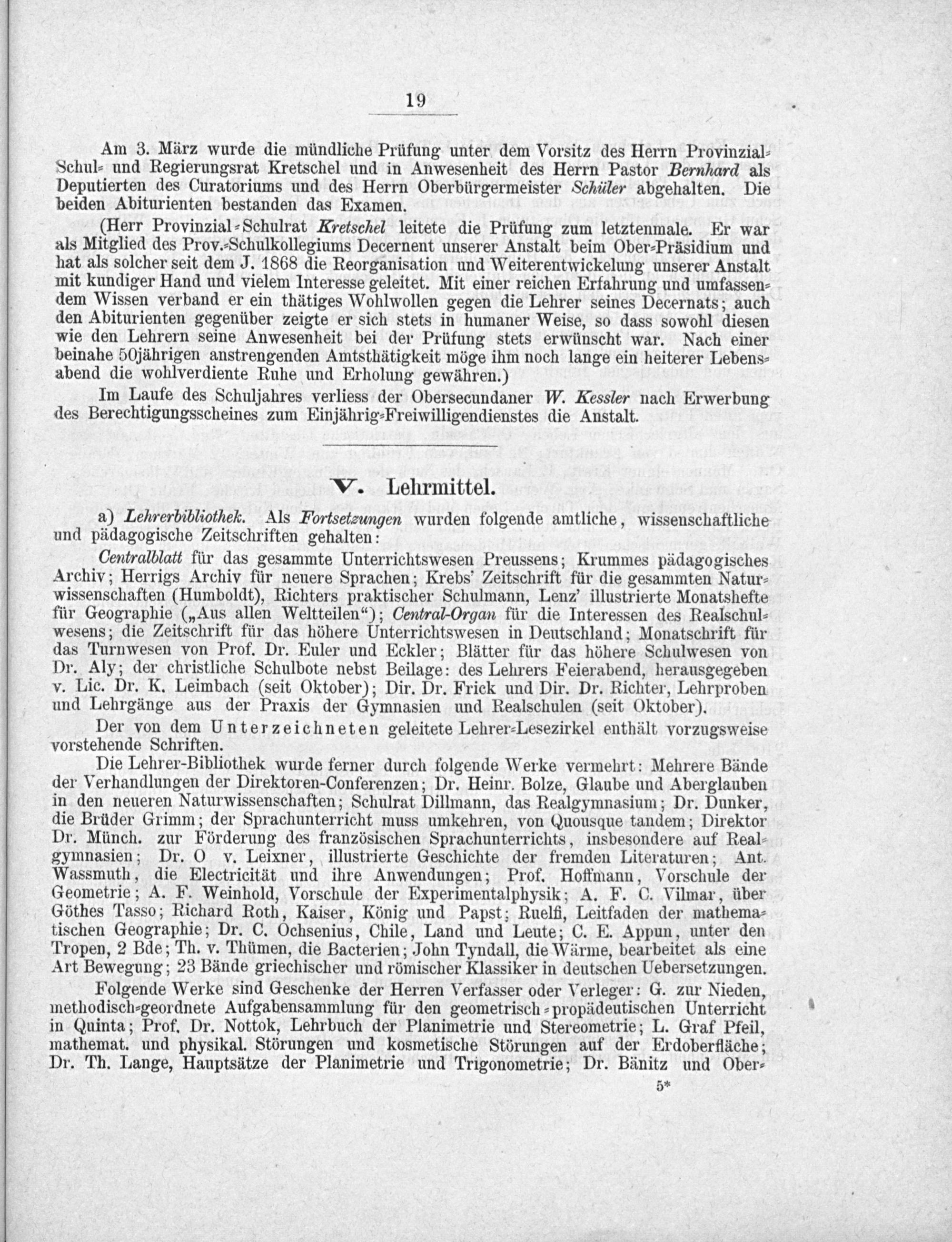 (Herr Provinzial⸗Schulrat Kretschel leitete die Prüfung zum letztenmale. Er war als Mitglied des Prov.⸗Schulkollegiums Decernent unserer Anstalt beim Ober⸗Präsidium und hat als solcher seit dem J. 1868 die Reorganisation und Weiterentwickelung unserer Anstalt mit kundiger Hand und vielem Interesse geleitet. Mit einer reichen Erfahrung und umfassen- dem Wissen verband er ein thätiges Wohlwollen gegen die Lehrer seines Decernats; auch den Abiturienten gegenüber zeigte er sich stets in humaner Weise, so dass sowohl diesen wie den Lehrern seine Anwesenheit bei der Prüfung stets erwünscht war. Nach einer beinahe 50 jährigen anstrengenden Amtsthätigkeit möge ihm noch lange ein heiterer Lebens-⸗ abend die wohlverdiente Ruhe und Erholung gewähren.)