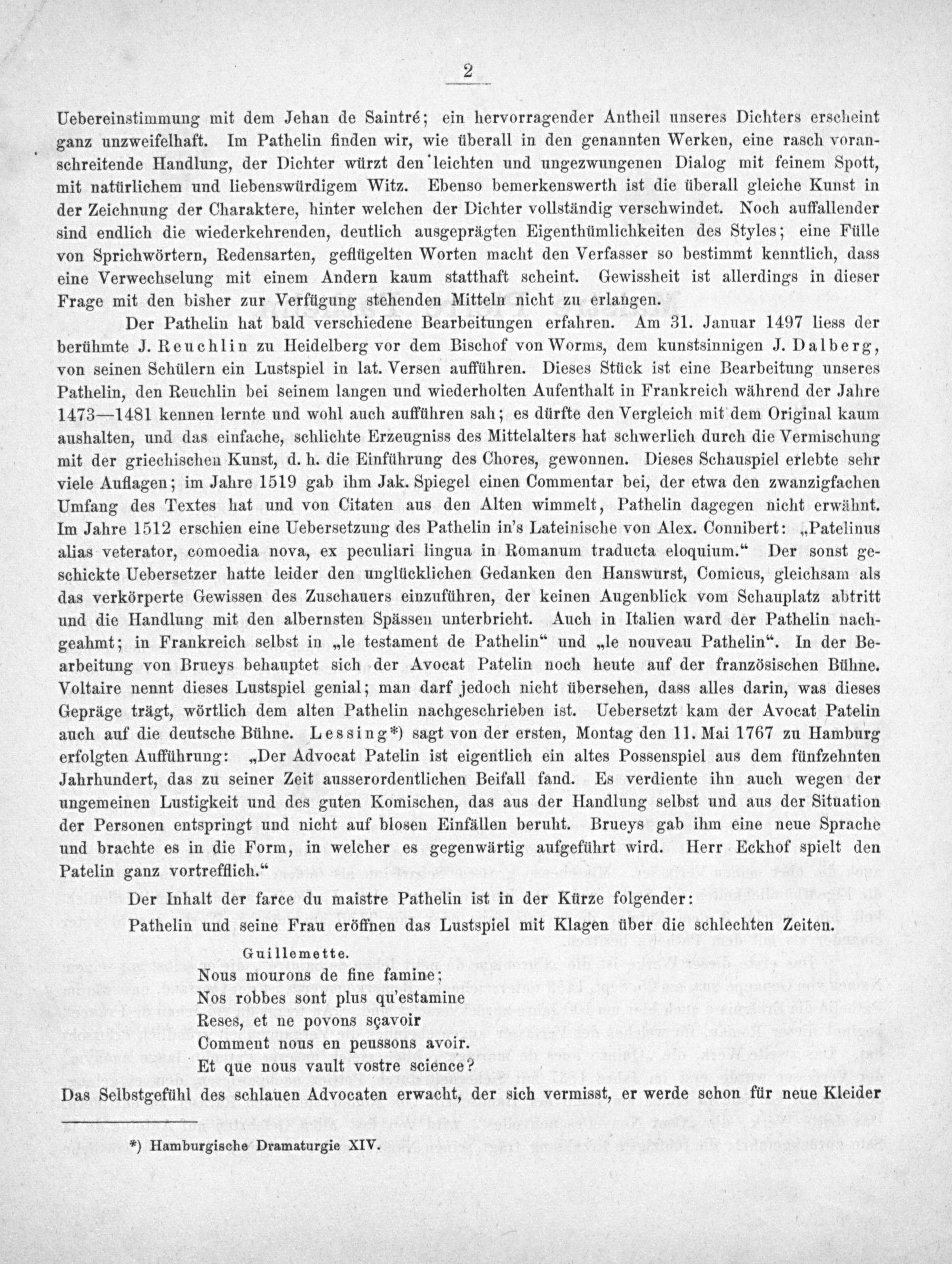 Der Pathelin hat bald verschiedene Bearbeitungen erfahren. Am 31. Januar 1497 liess der berühmte J. Reuchlin zu Heidelberg vor dem Bischof von Worms, dem kunstsinnigen J. Dalberg, von seinen Schülern ein Lustspiel in lat. Versen aufführen. Dieses Stück ist eine Bearbeitung unseres Pathelin, den Reuchlin bei seinem langen und wiederholten Aufenthalt in Frankreich während der Jahre 1473— 1481 kennen lernte und wohl auch aufführen sah; es dürfte den Vergleich mit dem Original kaum aushalten, und das einfache, schlichte Erzeugniss des Mittelalters hat schwerlich durch die Vermischung mit der griechischen Kunst, d. h. die Einführung des Chores, gewonnen. Dieses Schauspiel erlebte sehr viele Auflagen; im Jahre 1519 gab ihm Jak. Spiegel einen Commentar bei, der etwa den zwanzigfachen Umfang des Textes hat und von Citaten aus den Alten wimmelt, Pathelin dagegen nicht erwähnt. Im Jahre 1512 erschien eine Uebersetzung des Pathelin in's Lateinische von Alex. Connibert:„Patelinus alias veterator, comoedia nova, ex peculiari lingua in Romanum traducta eloquium.“ Der sonst ge- schickte Uebersetzer hatte leider den unglücklichen Gedanken den Hanswurst, Comicus, gleichsam als das verkörperte Gewissen des Zuschauers einzuführen, der keinen Augenblick vom Schauplatz abtritt und die Handlung mit den albernsten Spässen unterbricht. Auch in Italien ward der Pathelin nach- geahmt; in Frankreich selbst in„le testament de Pathelin“ und„le nouveau Pathelin“. In der Be- arbeitung von Brueys behauptet sich der Avocat Patelin noch heute auf der französischen Bühne. Voltaire nennt dieses Lustspiel genial; man darf jedoch nicht übersehen, dass alles darin, was dieses Gepräge trägt, wörtlich dem alten Pathelin nachgeschrieben ist. Uebersetzt kam der Avocat Patelin auch auf die deutsche Bühne. Lessing) sagt von der ersten, Montag den 11. Mai 1767 zu Hamburg erfolgten Aufführung:„Der Advocat Patelin ist eigentlich ein altes Possenspiel aus dem fünfzehnten Jahrhundert, das zu seiner Zeit ausserordentlichen Beifall fand. Es verdiente ihn auch wegen der ungemeinen Lustigkeit und des guten Komischen, das aus der Handlung selbst und aus der Situation der Personen entspringt und nicht auf blosen Einfällen beruht. Brueys gab ihm eine neue Sprache und brachte es in die Form, in welcher es gegenwärtig aufgeführt wird. Herr Eckhof spielt den Patelin ganz vortrefflich.“