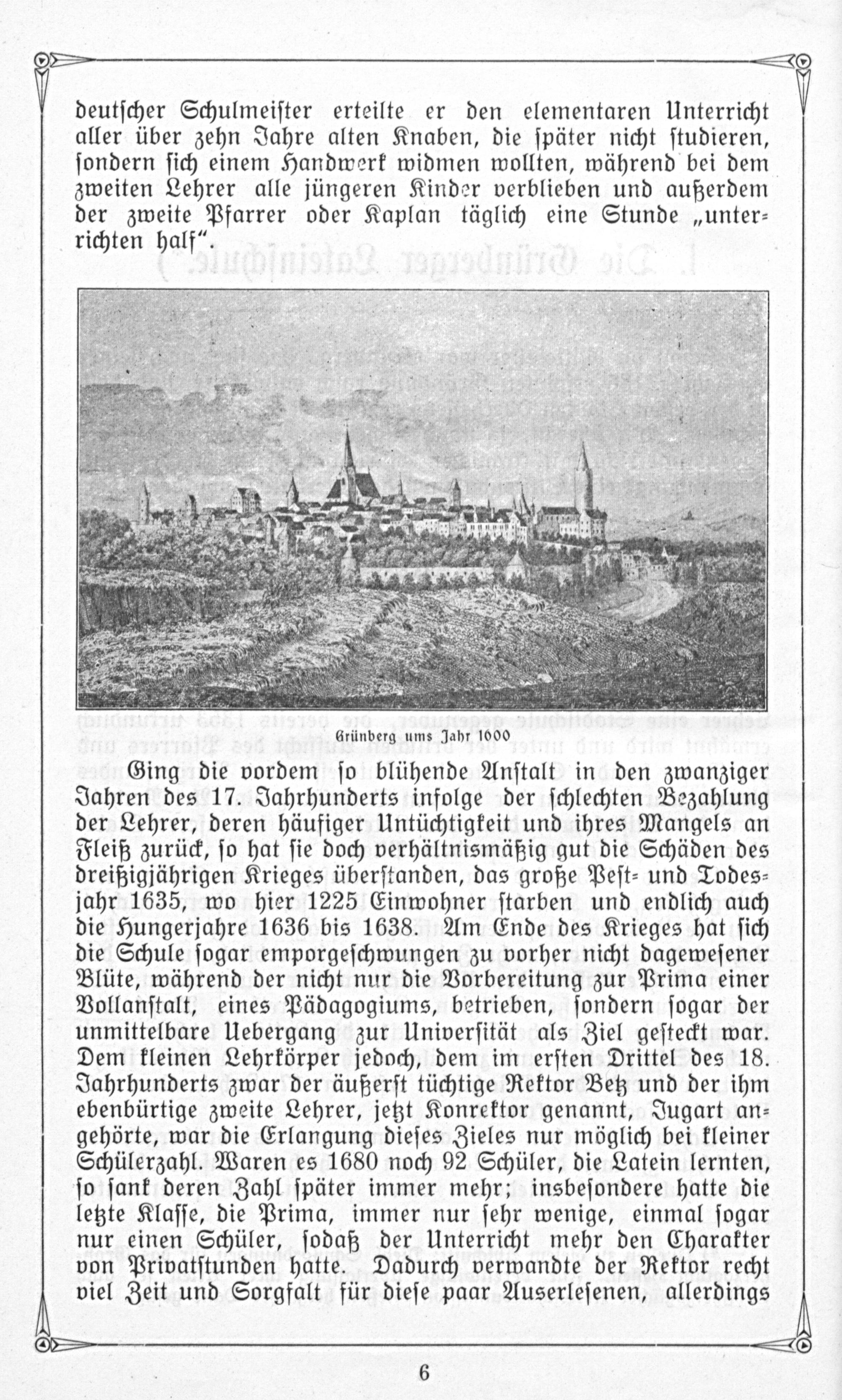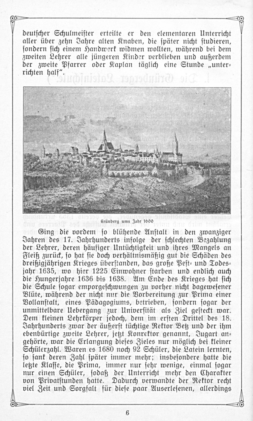 Ging die vordem ſo blühende Anſtalt in den zwanziger Jahren des 17. Jahrhunderts infolge der ſchlechten Bezahlung der Lehrer, deren häufiger Untüchtigkeit und ihres Mangels an Fleiß zurück, ſo hat ſie doch verhältnismäßig gut die Schäden des dreißigjährigen Krieges überſtanden, das große Peſt⸗ und Todes⸗ jahr 1635, wo hier 1225 Einwohner ſtarben und endlich auch die Hungerjahre 1636 bis 1638. Am Ende des Krieges hat ſich die Schule ſogar emporgeſchwungen zu vorher nicht dageweſener Blüte, während der nicht nur die Vorbereitung zur Prima einer Vollanſtalt, eines Pädagogiums, betrieben, ſondern ſogar der unmittelbare Uebergang zur Univerſität als Ziel geſteckt war. Dem kleinen Lehrkörper jedoch, dem im erſten Drittel des 18. Jahrhunderts zwar der äußerſt tüchtige Rektor Betz und der ihm ebenbürtige zweite Lehrer, jetzt Konrektor genannt, Jugart an⸗ gehörte, war die Erlangung dieſes Zieles nur möglich bei kleiner Schülerzahl. Waren es 1680 noch 92 Schüler, die Latein lernten, ſo ſank deren Zahl ſpäter immer mehr; insbeſondere hatte die letzte Klaſſe, die Prima, immer nur ſehr wenige, einmal ſogar nur einen Schüler, ſodaß der Unterricht mehr den Charakter von Privatſtunden hatte. Dadurch verwandte der Rektor recht viel Zeit und Sorgfalt für dieſe paar Auserleſenen, allerdings