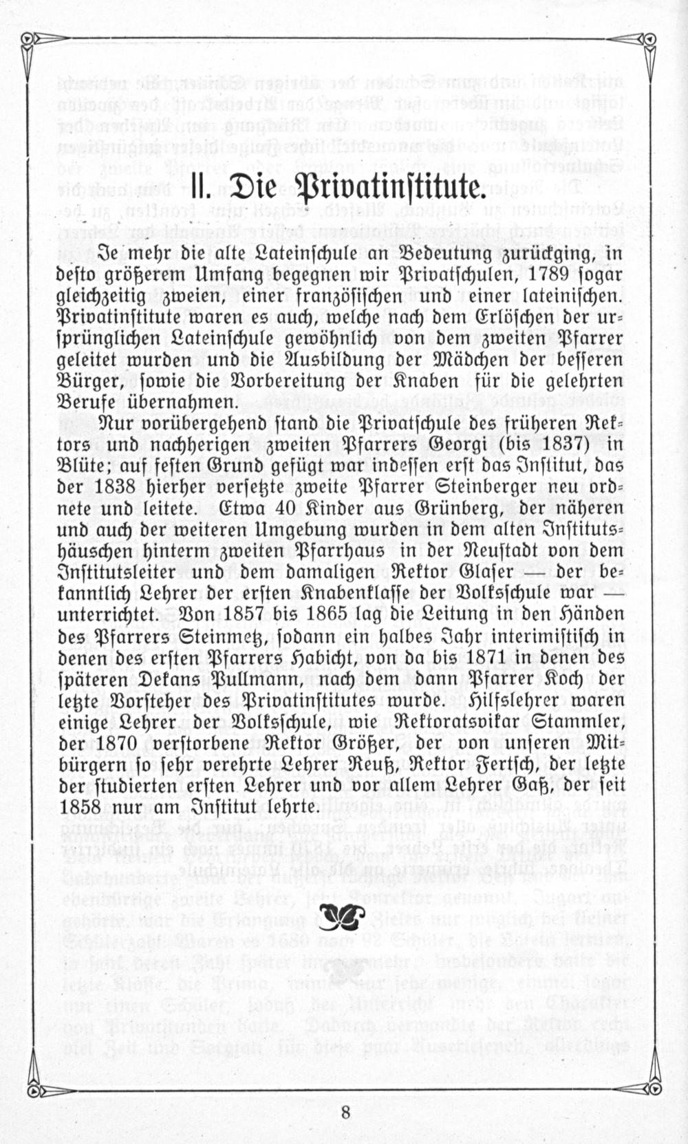Nur vorübergehend ſtand die Privatſchule des früheren Rek— tors und nachherigen zweiten Pfarrers Georgi(bis 1837) in Blüte; auf feſten Grund gefügt war indeſſen erſt das Inſtitut, das der 1838 hierher verſetzte zweite Pfarrer Steinberger neu ord⸗ nete und leitete. Etwa 40 Kinder aus Grünberg, der näheren und auch der weiteren Umgebung wurden in dem alten Inſtituts⸗ häuschen hinterm zweiten Pfarrhaus in der Neuſtadt von dem Inſtitutsleiter und dem damaligen Rektor Glaſer— der be⸗ kanntlich Lehrer der erſten Knabenklaſſe der Volksſchule war— unterrichtet. Von 1857 bis 1865 lag die Leitung in den Händen des Pfarrers Steinmetz, ſodann ein halbes Jahr interimiſtiſch in denen des erſten Pfarrers Habicht, von da bis 1871 in denen des ſpäteren Dekans Pullmann, nach dem dann Pfarrer Koch der letzte Vorſteher des Privatinſtitutes wurde. Hilfslehrer waren einige Lehrer der Volksſchule, wie Rektoratsvikar Stammler, der 1870 verſtorbene Rektor Größer, der von unſeren Mit⸗ bürgern ſo ſehr verehrte Lehrer Reuß, Rektor Fertſch, der letzte der ſtudierten erſten Lehrer und vor allem Lehrer Gaß, der ſeit 1858 nur am Inſtitut lehrte.