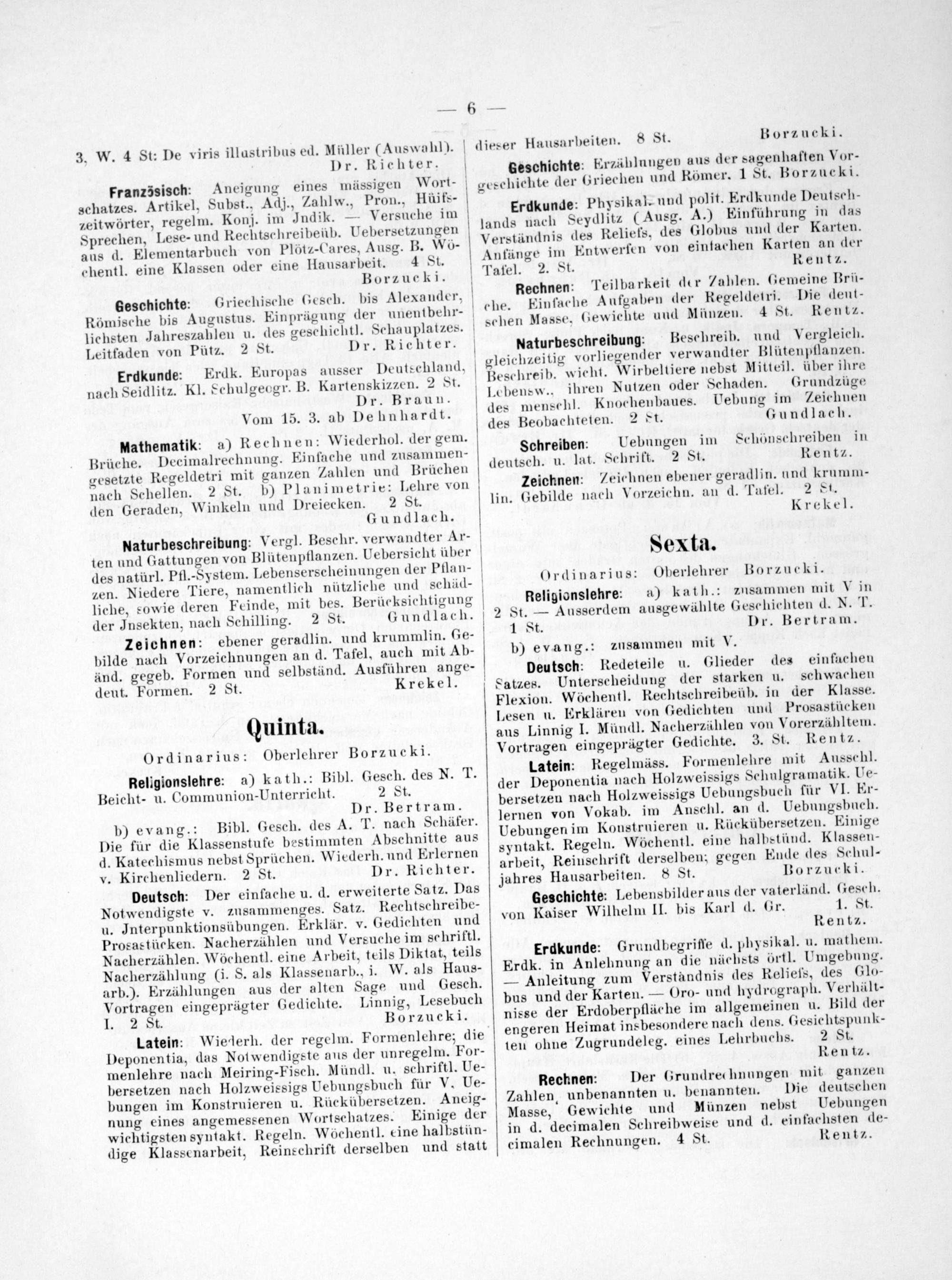 Deutsch: Redeteile u. Glieder des einfachen Unterscheidung der starken u. schwachen Flexion. Wöchentl. Rechtschreibeüb. in der Klasse. Lesen u. Erklären von Gedichten und Prosastücken aus Linnig I. Mündl. Nacherzühlen von Vorerzäühltem. Vortragen eingeprägter Gedichte. 3. St. Rentz. Latein: Regelmäss. Formenlehre mit Ausschl. der Deponentia nach Holzweissigs Schulgramatik. Ue- bersetzen nach Holzweissigs Uebungsbuch für VI. Er- lernen von Vokab. im Anschl. an d. Uebungsbuch. Uebungen im Koustruieren u. Rückübersetzen. Einige syntakt. Regeln. Wöchentl. eine halbstünd. Klassen- arbeit, Reiuschrift derselben; gegen Ende des Schul- jahres Hausarbeiten. 8 St. Borzucki. Geschichte: Lebensbilder von Kaiser Wilhelm II. bis Karl d. Gr.