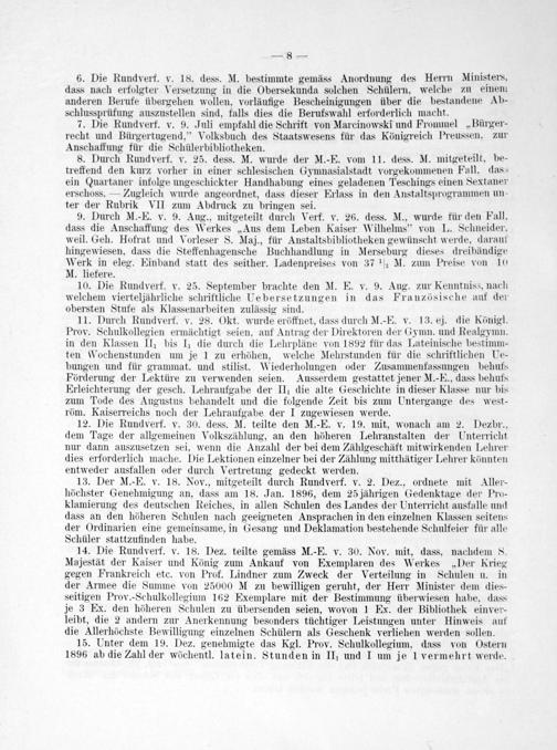 15. Unter dem 19. Dez. genehmigte das Kgl. Prov. Schulkollegium, dass von Ostern 1896 ab die Zahl der wöchentl. latein. Stunden in II und I um je 1 vermehrt werde.
