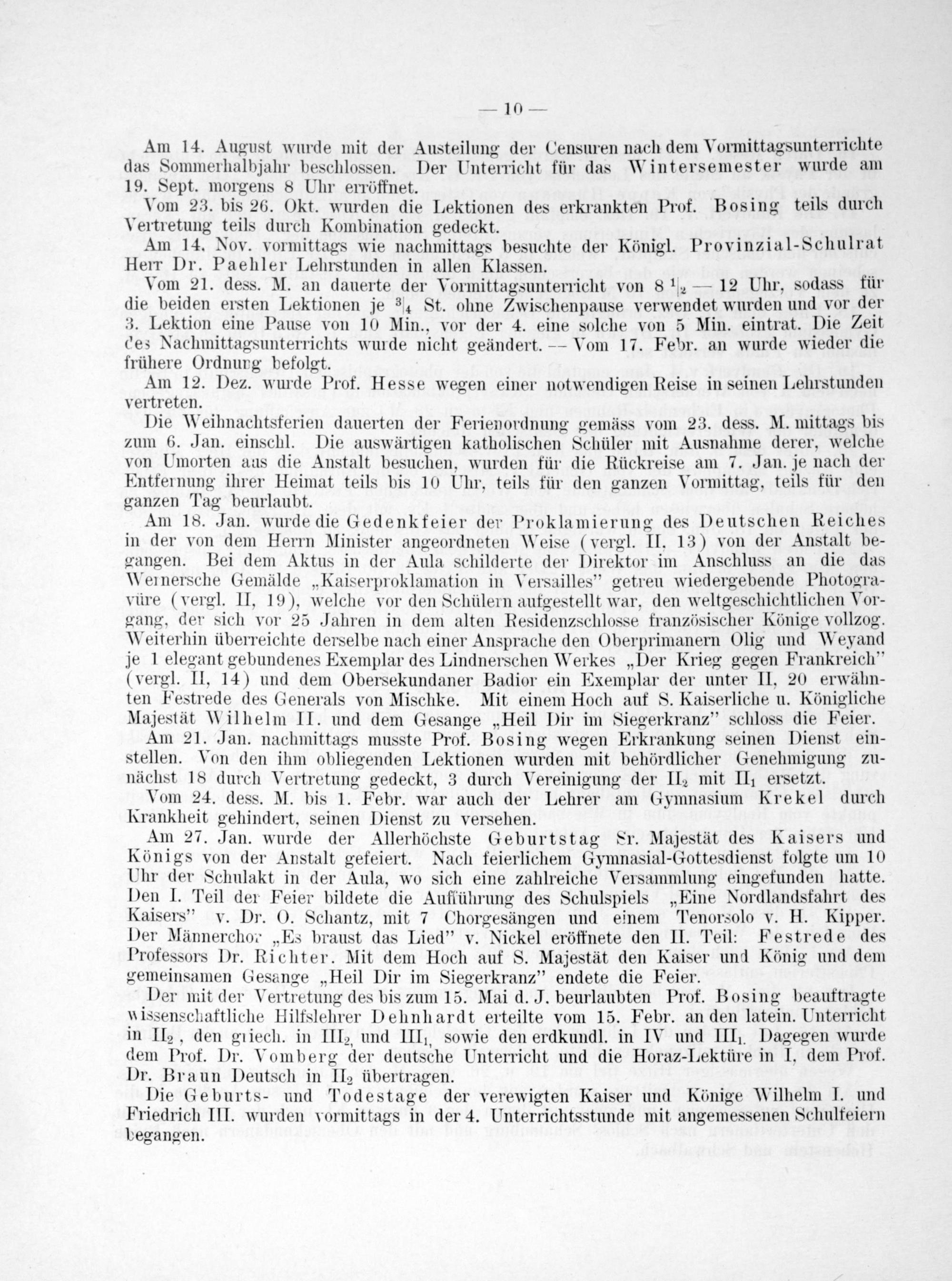 Der mit der Vertretung des bis zum 15. Mai d. J. beurlaubten Prof. Bosing beauftragte wissenschaftliche Hilfslehrer Dehnhardt erteilte vom 15. Febr. an den latein. Unterricht in IIe, den griech. in III, und IIII, sowie den erdkundl. in IV und IIII. Dagegen wurde dem Prof. Dr. Vomberg der deutsche Unterricht und die Horaz-Lektüre in I, dem Prof. Dr. Braun Deutsch in II übertragen.