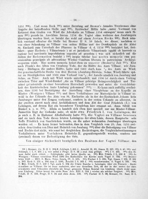 204) Kremer, Or. N. II S. 284 ff., Schlieph. I, 455 f., Arnoldi II, 63, Simon II, 127. ²05) S. 47. 206) und Schlieph.(I, S. 431) u. wir selbst(Progr. II S. 24) sind ihm gefolgt. 207) 1 S. 231. 2⁰) den Si- mon dafür auch citiert— Schliephake gibt keine Quelle an. 2⁰⁹) Mitt. Urkdb. I S. 638 ff. 210) JIn Wenigen-Villmar verschloss Wied 1582 den Katholiken die Kirche nach Vogel S. 792. 211) Brower lebte 1550— 1617. S. Marx, Trier. Gesch, IV, S. 523. 21²) Fischer I S. 225. Vgl. Simon I 231, II 181 u. 283. Reck S. 131 u. 184 zum J. 1581, Arnoldi I S. 163 f. 2¹13) verschwunden. S. Vogel S. 793. 2¹4) S. Mitt. Urkdb. II S. 158 f. Vgl. auch S. 334 die Urkde Emichs v. Leiningen über ein Precarie- Recht desselben zu Villmar. Sie ist zwar undatiert, aber aus derselben Zeit, da der in der ersten der oben erwähnten zwei Urkunden ebenfalls als Zeuge genannte Dekan Konrad von Limburg(doch wohl unse- rem Limburg. Götze kennt ihn nicht Nass. Ann. XIII S. 314) wieder als solcher fungiert. 2²¹15) Mitt. Urkdb. II S. 332, Progr. II S. 24 und oben Anm. 118. 216) Fischer II S. 30; Kremer, Or. Nass. II S. 284.