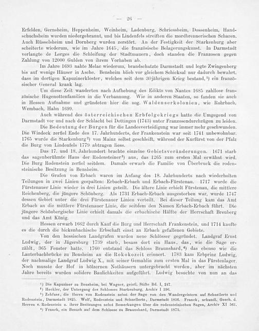 Das 17. und 18. Jahrhundert brachte einzelne Gebietsveränderungen. 1671 starb das sagenberühmte Haus der Rodensteiner¹) aus, das 1265 zum ersten Mal erwähnt wird. Die Burg Rodenstein zerfiel seitdem. Damals erwarb die Familie von UÜberbruck die roden- steinische Besitzung in Bensheim.