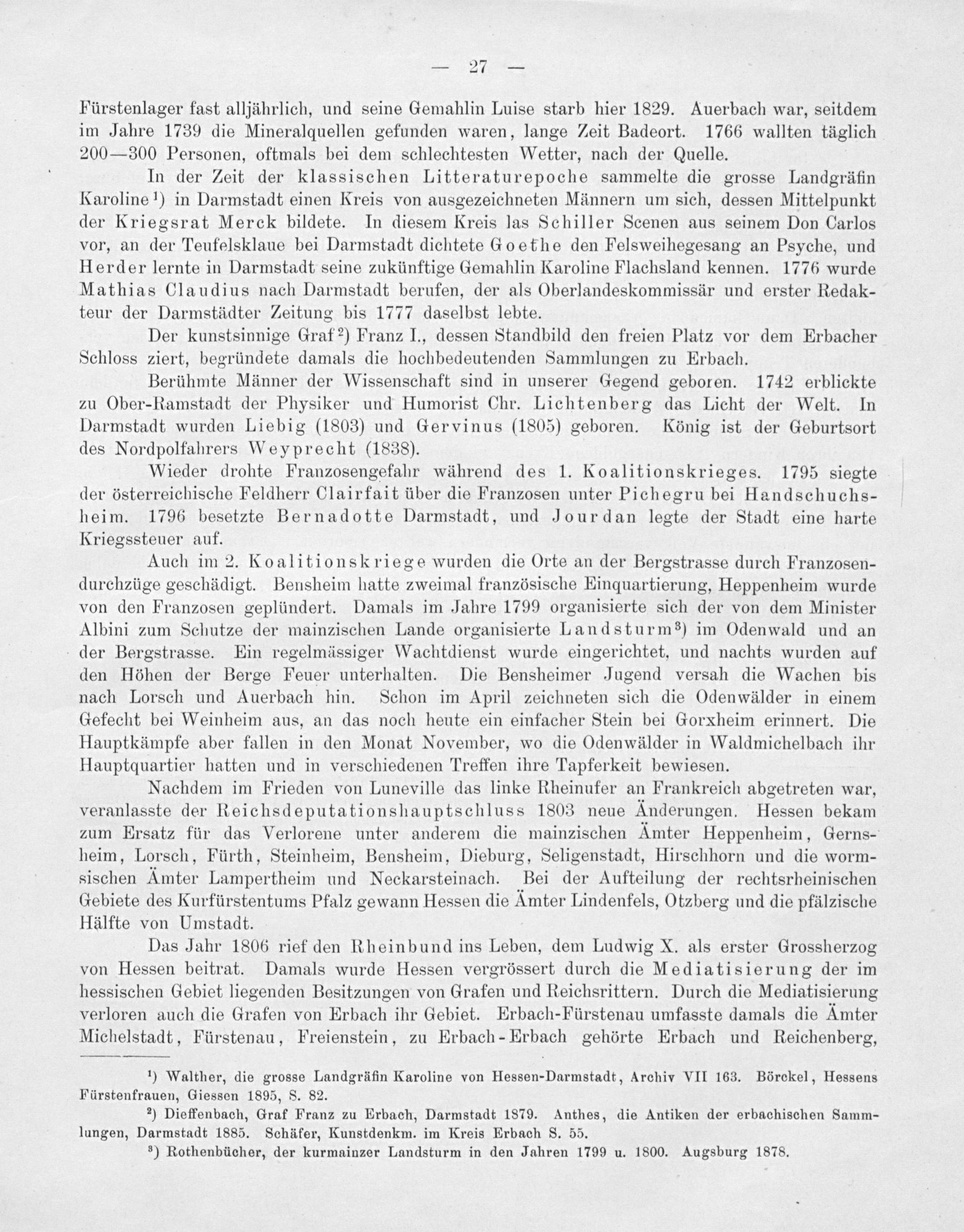 In der Zeit der klassischen Litteraturepoche sammelte die grosse Landgräfin Karoline ¹) in Darmstadt einen Kreis von ausgezeichneten Männern um sich, dessen Mittelpunkt der Kriegsrat Merck bildete. In diesem Kreis las Schiller Scenen aus seinem Don Carlos vor, an der Teufelsklaue bei Darmstadt dichtete Goethe den Felsweihegesang an Psyche, und Herder lernte in Darmstadt seine zukünftige Gemahlin Karoline Flachsland kennen. 1776 wurde Mathias Claudius nach Darmstadt berufen, der als Oberlandeskommissär und erster Redak- teur der Darmstädter Zeitung bis 1777 daselbst lebte.