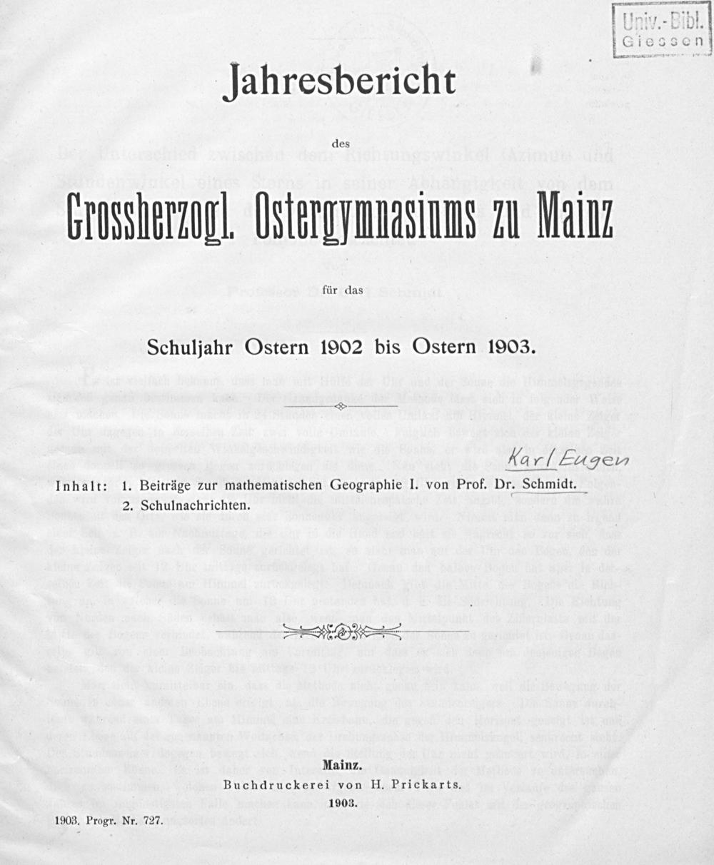 Mainz. Buchdruckerei von H. Prickarts. 1903. 1903. Progr. Nr. 727.