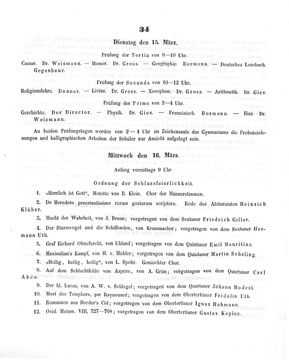 9. Der hl. Lucas, von A. W. v. Schlegel; vorgetragen von dem Quartaner Johann Modest. 10. Mort des Templiers, par Raynouard; vorgetragen von dem Obertertianer Fridolin Uth. 11. Romanzen aus Herder's Cid; vorgetragen von dem Obertertianer Ignaz Hohmann.